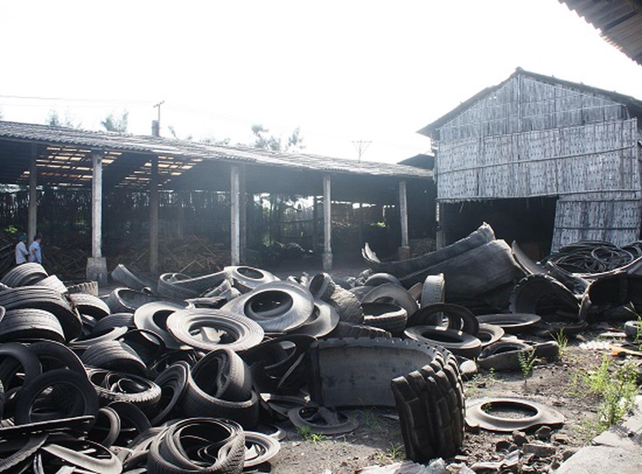 Khu vực chưng cất dầu từ lốp cao su phế thải của Cty CP Gạch Kim Chính được xây dựng khá sơ sài và chỉ nằm cách khu dân cư chưa đầy 500m. Ảnh: Nguyễn Trường