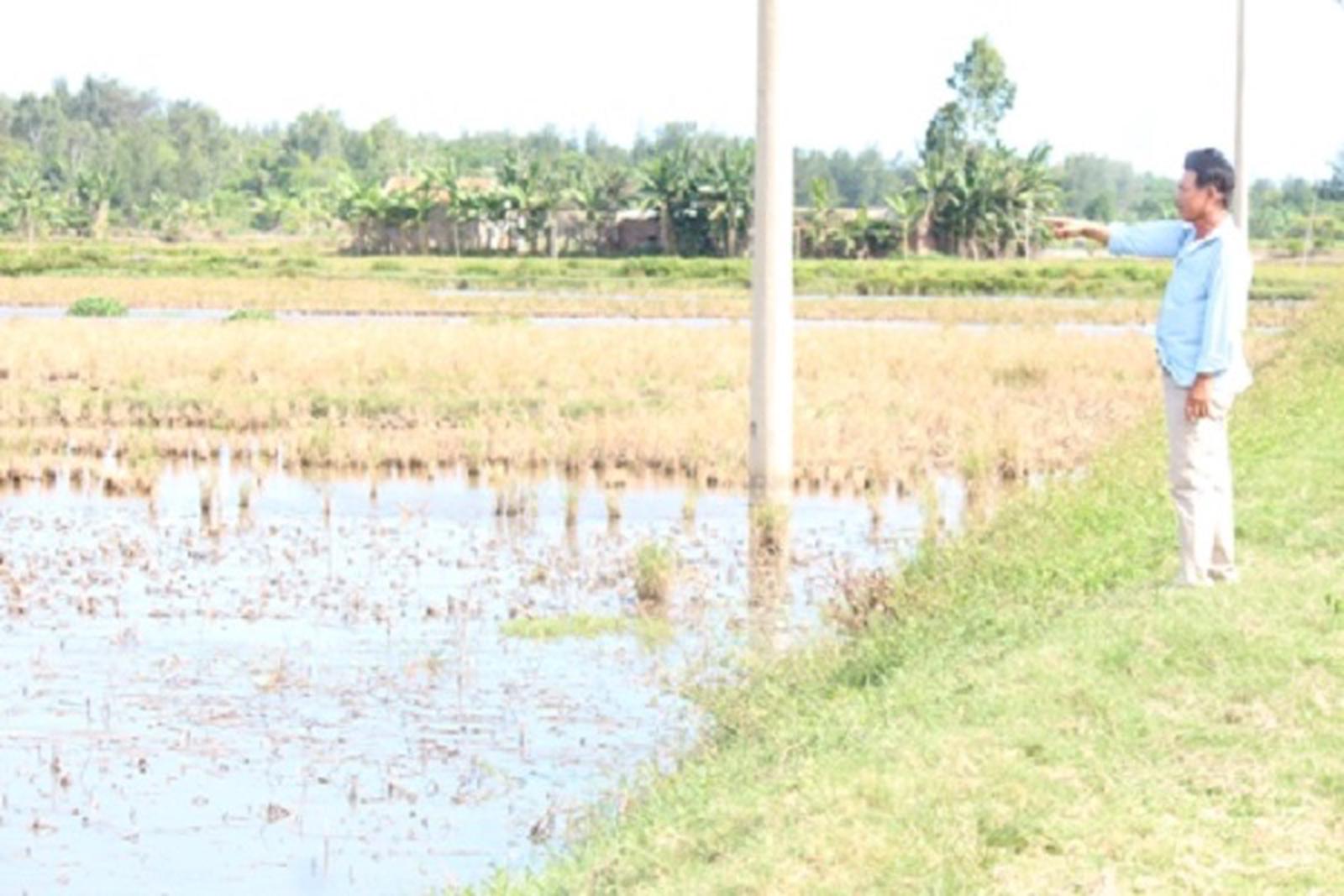 Thương binh Nguyễn Văn Đức lọc cọc dắt chiếc xe đạp cà tàng dẫn chúng tôi ra tận nơi mục sở thị. Nhìn cánh đồng ngập nước và lác đác vài cây cỏ, ông Đức chua xót: “Tôi thương binh, vợ thường xuyên đau ốm, tuổi già cậy nhờ vào 2 sào 10 đất lúa này để sống qua ngày. Nay nó nhiễm mặn không thể gieo cấy được, mấy vụ mất trắng cả anh ạ, mong sao báo chí, truyền hình đưa lên để cơ quan chuyên môn xác định nguyên nhân, tìm ra giải pháp cho bà con chúng tôi có kế mưu sinh. Chứ tình trạng này thì đi ăn mày cả xóm thôi".
