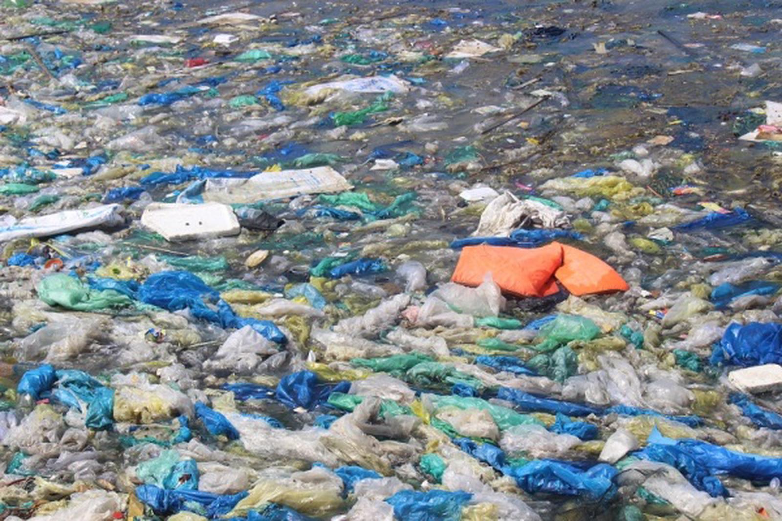 Mặt biển đặc kín bịch nilon, chai nhựa như “lưới rác”. Ảnh: Xuân Hướng