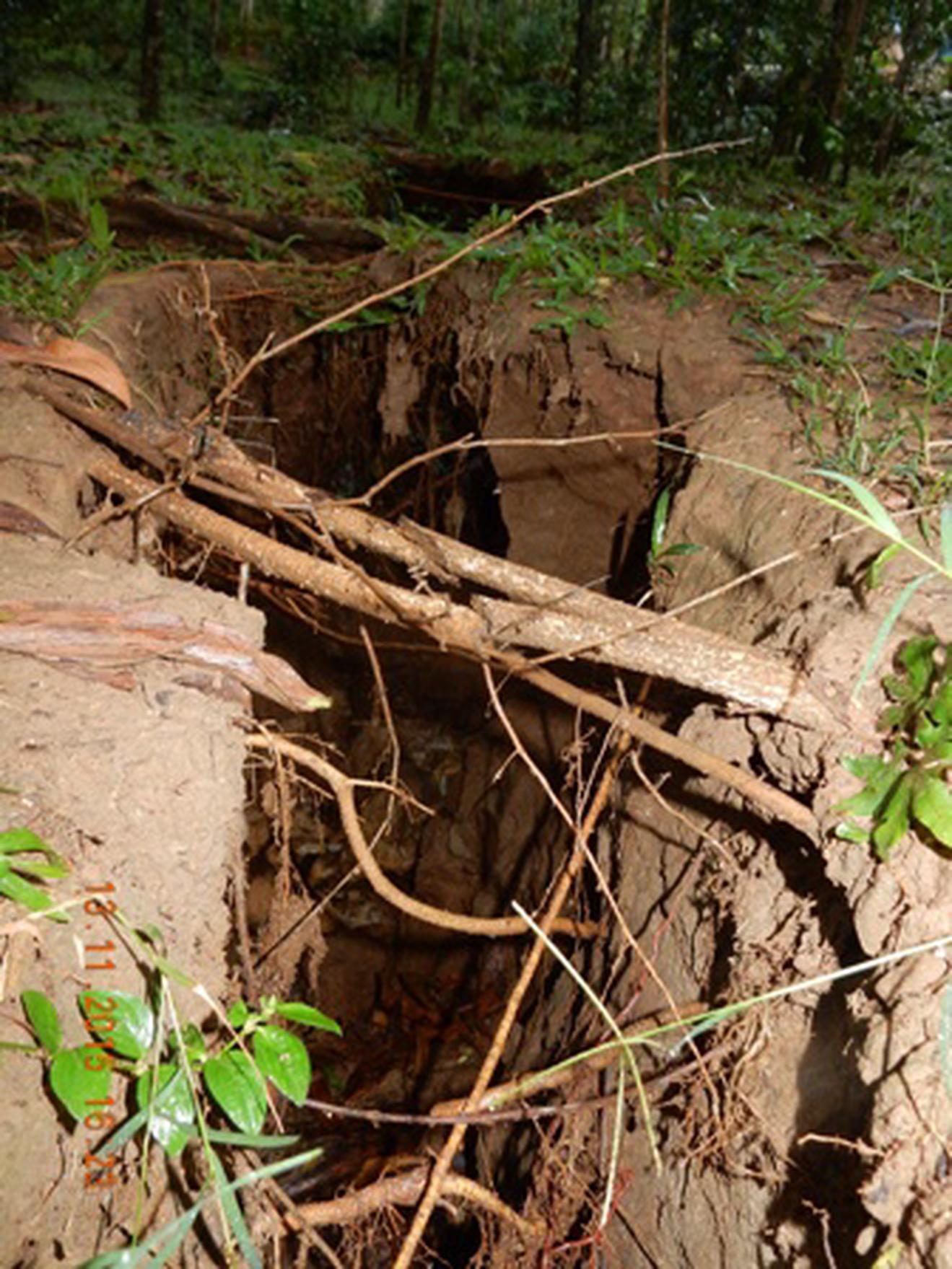 Vết nứt lớn chạy dọc cắt ngang vườn keo của người dân có chiều dài hơn 100m. Ảnh: Lương Ý
