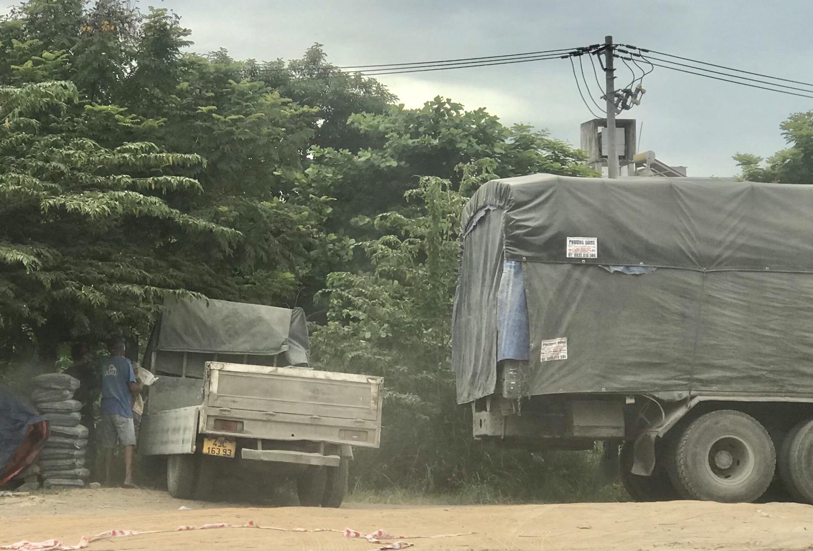 Theo quan sát của chúng tôi, tại kho bãi trái phép mỗi ngày có từ 5 - 7 xe tải trọng 40 - 50 tấn, mang biển số 43A, 92A,75A, biển xe Lào… chuyên chở các loại xi măng mang thương hiệu Kim Đỉnh, Hoàng Thạch, Xuân Thành, Đồng Lâm, Coseco… trong đêm khuya về đây để sáng hôm sau lực lượng bốc vác đưa lên các xe tải trọng nhỏ vận chuyển đến các công trình có nhu cầu.