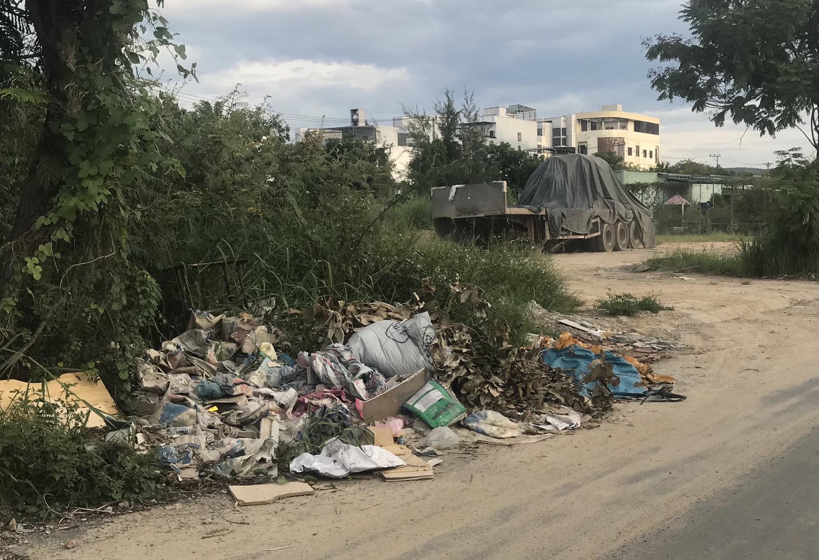 Rác rưởi đổ ven bãi tập kết xi măng. Ảnh: N.P