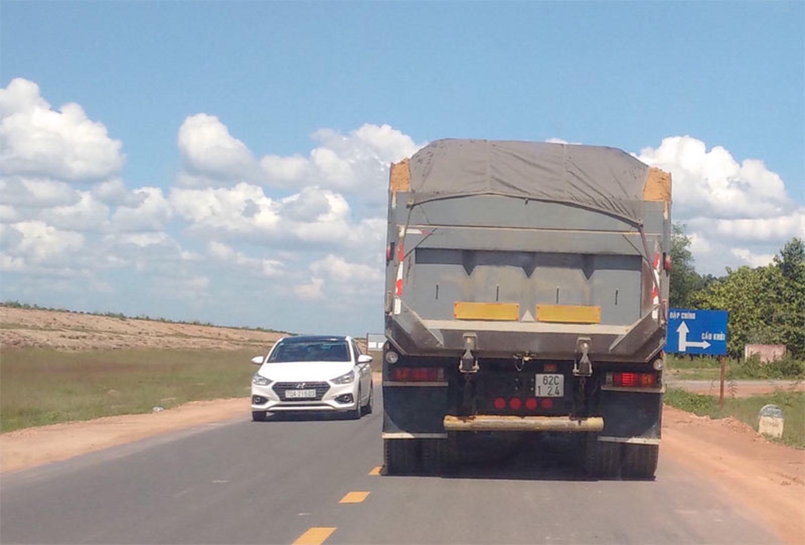 Xe tải chở cát có dấu hiệu quá khổ giới hạn từ lòng hồ Dầu Tiếng lưu thông vào đường ĐT 781. Ảnh: NT