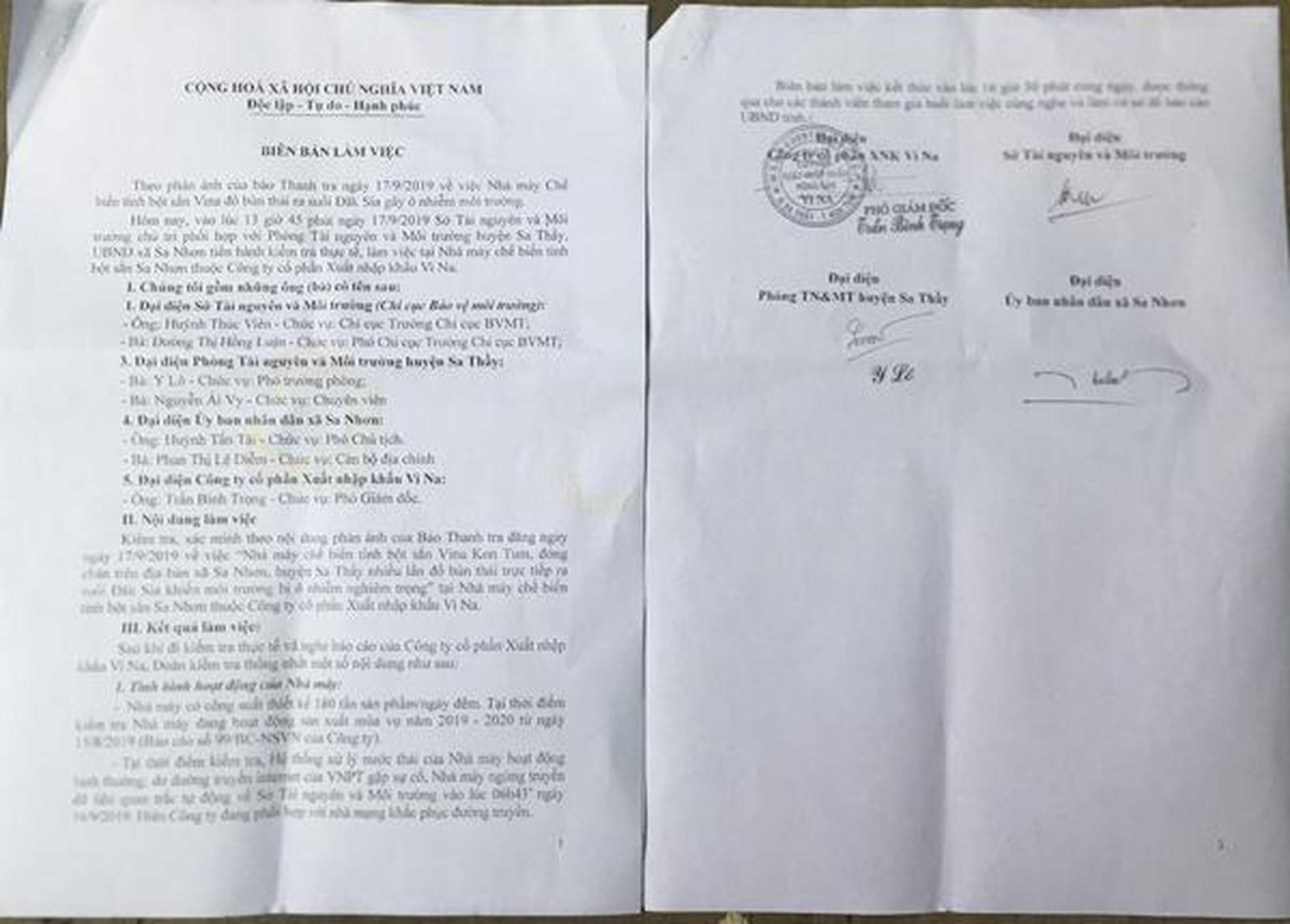 Biên bản làm việc của đoàn kiểm tra liên ngành với nhà máy sắn. Ảnh: KN