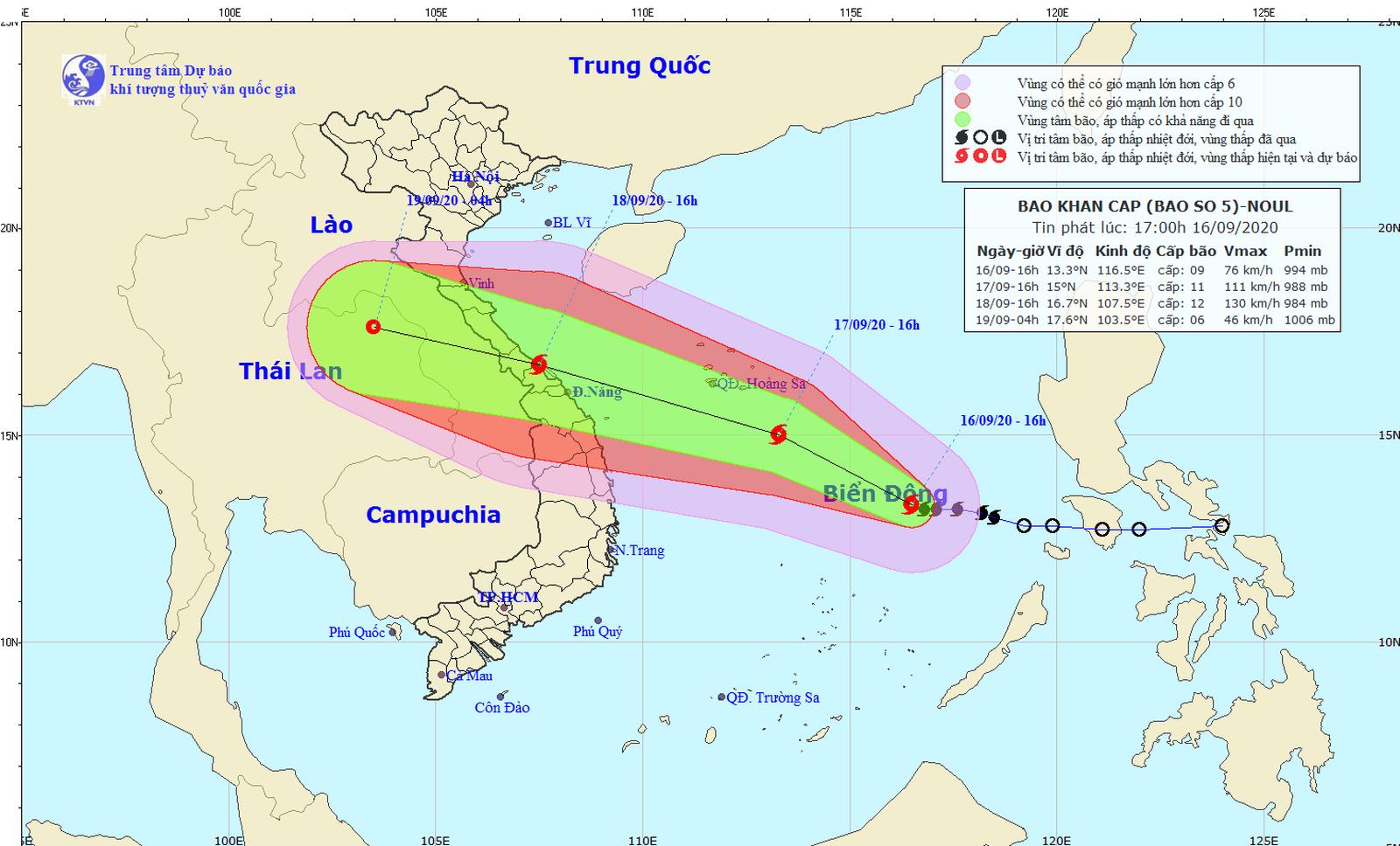 Vị trí và hướng đi cơn bão số 5 lúc 17h ngày 16/9. Ảnh: Trung tâm Dự báo KTTV quốc gia