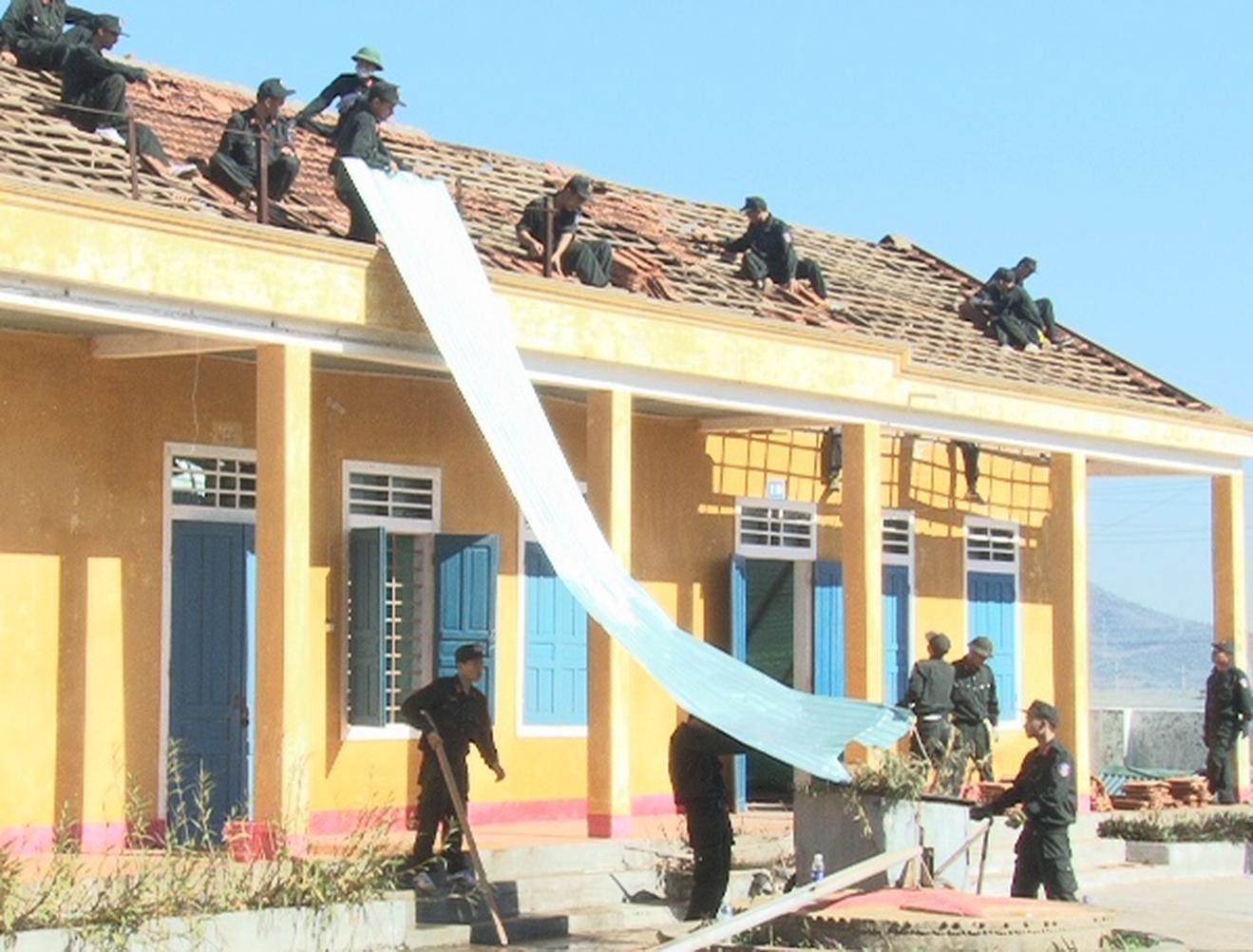 Các đơn vị quân đội giúp dân sửa chữa lại nhà cửa, trường lớp sau bão số 10. Ảnh: TQ
