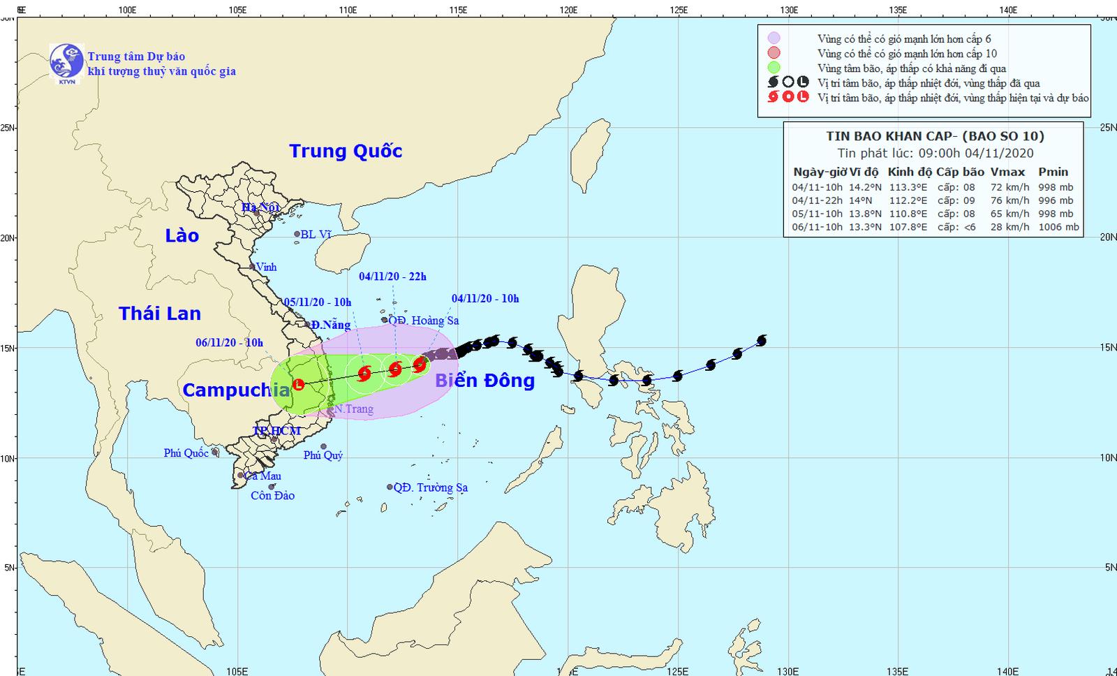 Lúc 10 giờ sáng nay (4/11), vị trí tâm bão số 10 ở khoảng 14,2 độ Vĩ Bắc; 113,3 độ Kinh Đông, cách quần đảo Hoàng Sa khoảng 320km về phía Nam Đông Nam. Sức gió mạnh nhất vùng gần tâm bão mạnh cấp 8 (60 - 75km/giờ), giật cấp 10.