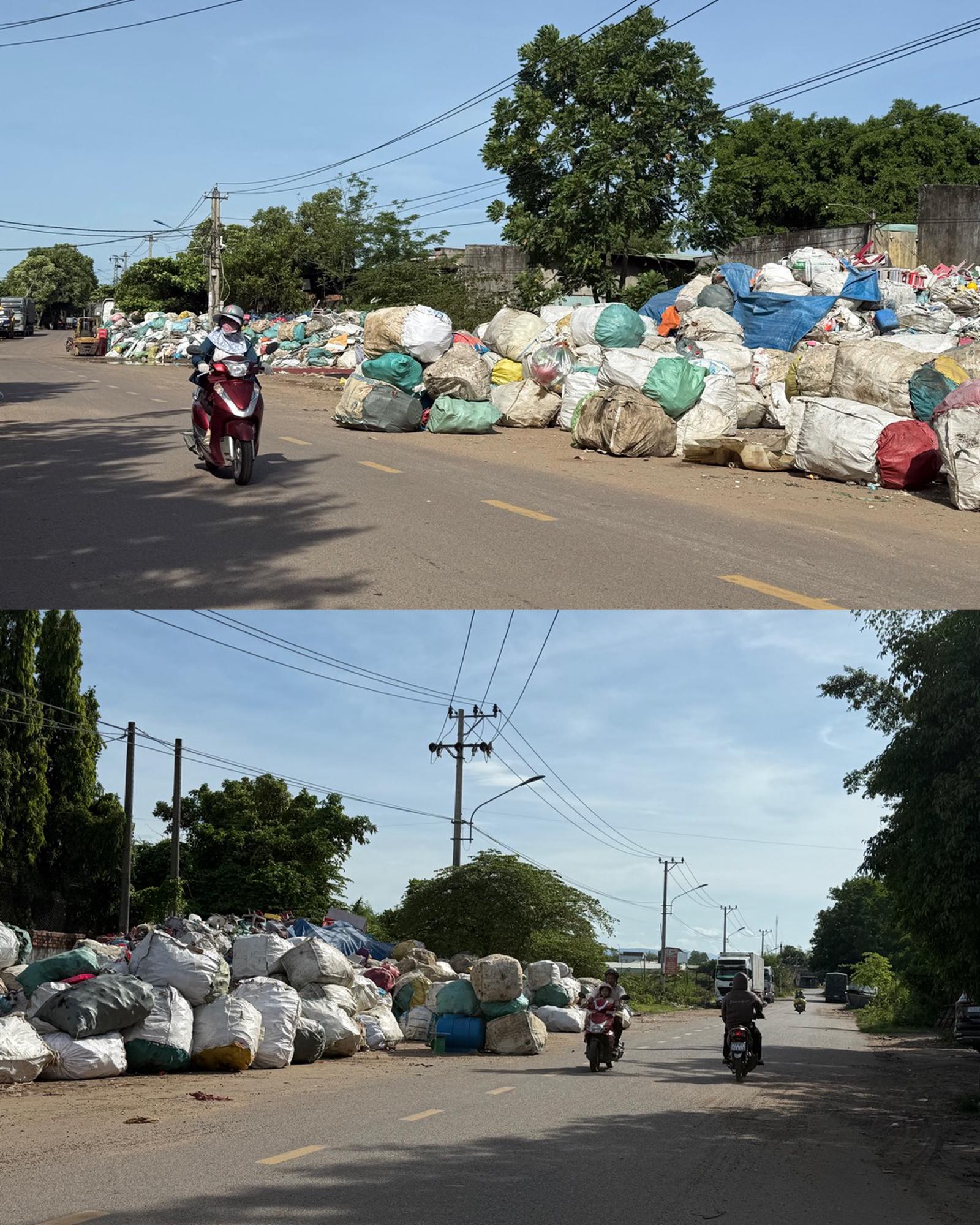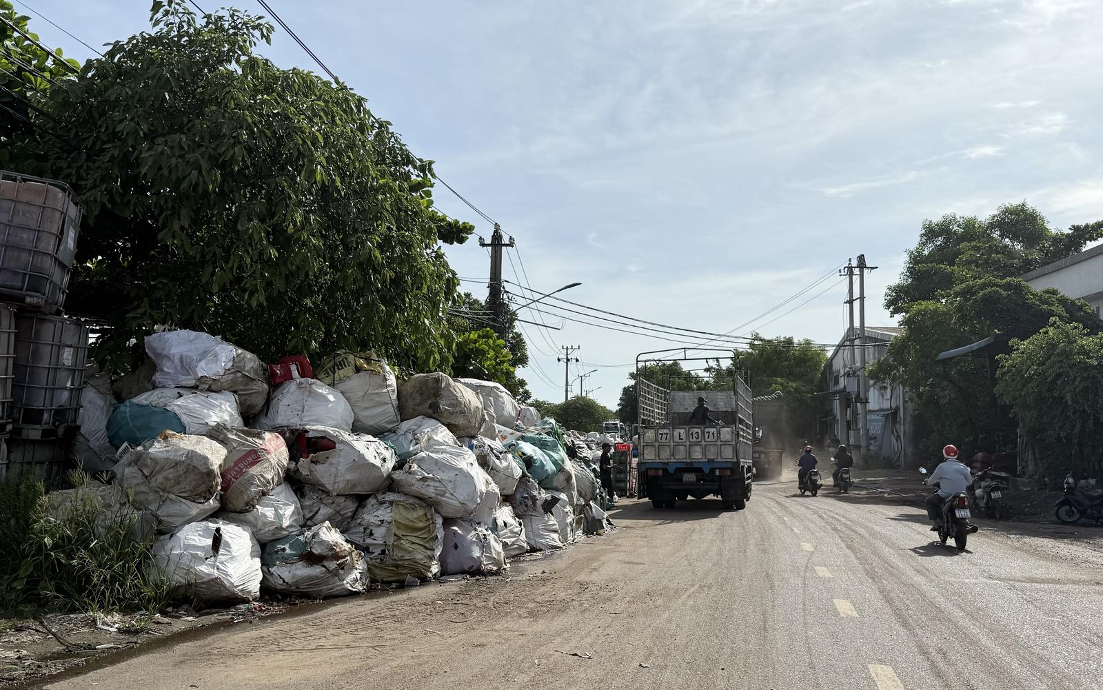 Ghi nhận thực tế, tại tuyến đường Nguyễn Nhạc, phường An Nhơn, tỉnh Gia Lai, hàng trăm bao tải phế liệu đủ các loại chất đống tràn cả xuống lòng đường. Không ít người đi đường buộc phải lấn sang làn xe đối diện để tránh, tiềm ẩn nguy cơ va chạm giao thông.