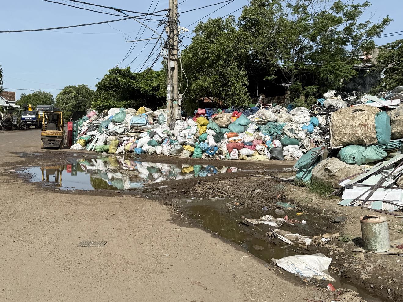 Không chỉ gây cản trở giao thông, các đống phế liệu này còn phát sinh nước thải, đọng lại thành vũng lớn kéo dài nhiều mét, sẫm màu và bốc mùi.