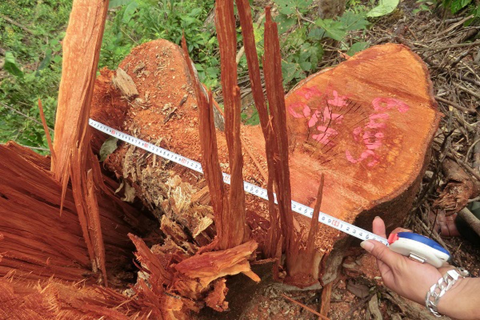 Hàng chục cây gỗ sâng có đường kính hơn 1m bị chặt hạ. Ảnh: Hồng Bài