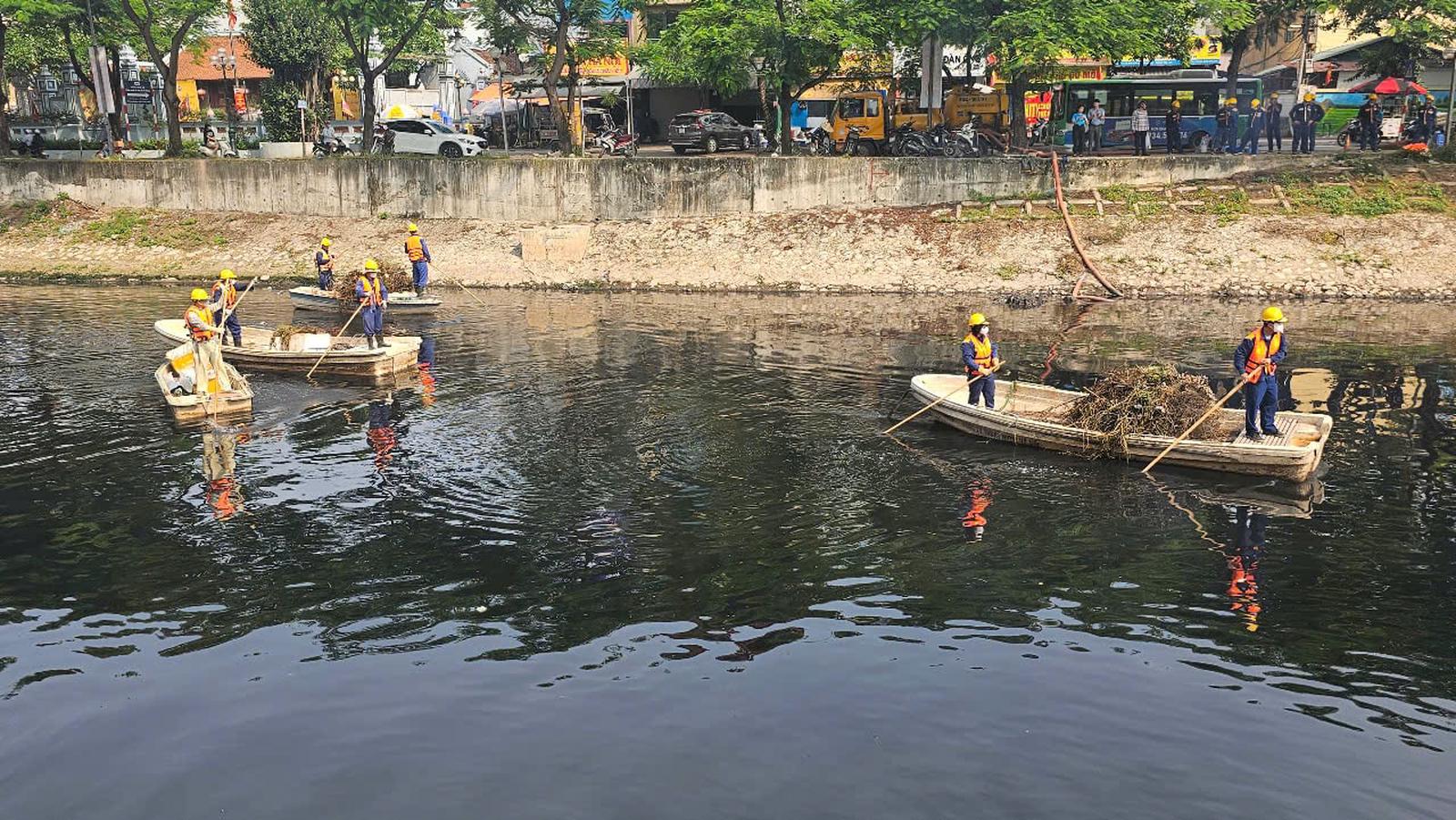 Công nhân thu gom, nạo vét "hồi sinh" sông Tô Lịch. Ảnh: HH