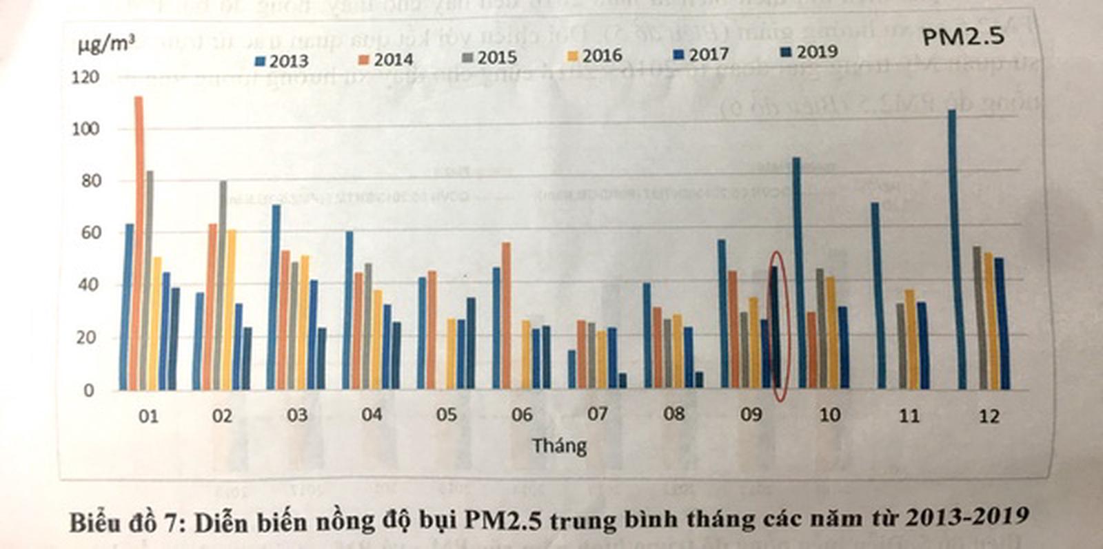 So sánh nồng độ bụi PM2.5 trong các tháng qua các năm từ năm 2013 – 2019 cho thất, nồng độ bụi PM2.5 trong các tháng năm 2019 cũng có xu hướng giảm qua các năm. Riêng tháng 9, nồng độ bụi tăng mạnh so với các tháng trước đó và so với cùng kỳ các năm từ 2015 – 2018.