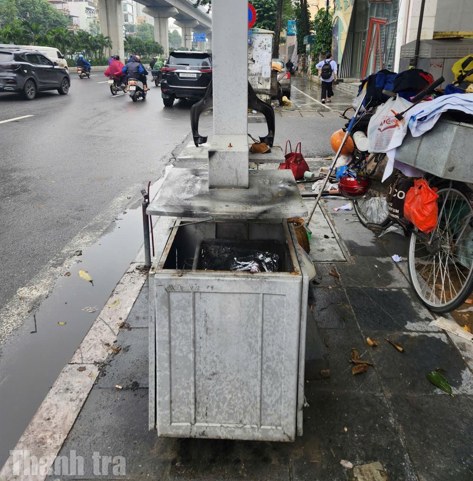 Hình ảnh những chiếc thùng rác "thông minh" trở nên nhếch nhác, hư hỏng tại các tuyến phố trung tâm như: Hoàng Đạo Thuý, Cầu Giấy, Trần Duy Hưng, Nguyễn Trãi, Lê Văn Lương… Hệ thống pin năng lượng chết, bảng quảng cáo tắt ngúm, nhiều thùng bị móp méo, bung cửa, thậm chí bị chèn gạch, đậy tấm chắn để người dân không thể đổ rác.