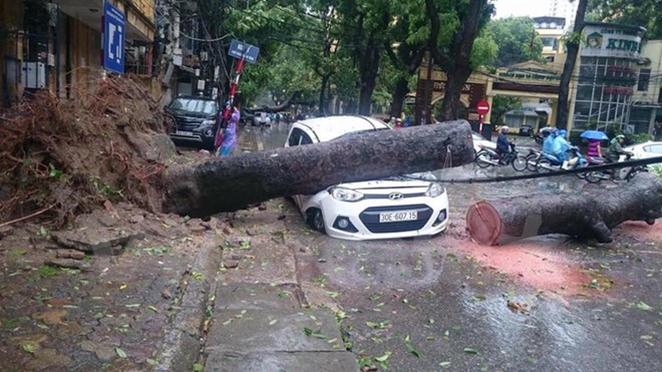 Cây đổ đè lên một chiếc xe ôtô trên đường Trần Thánh Tông, sáng 28/7. (Nguồn: PV/Vietnam+)