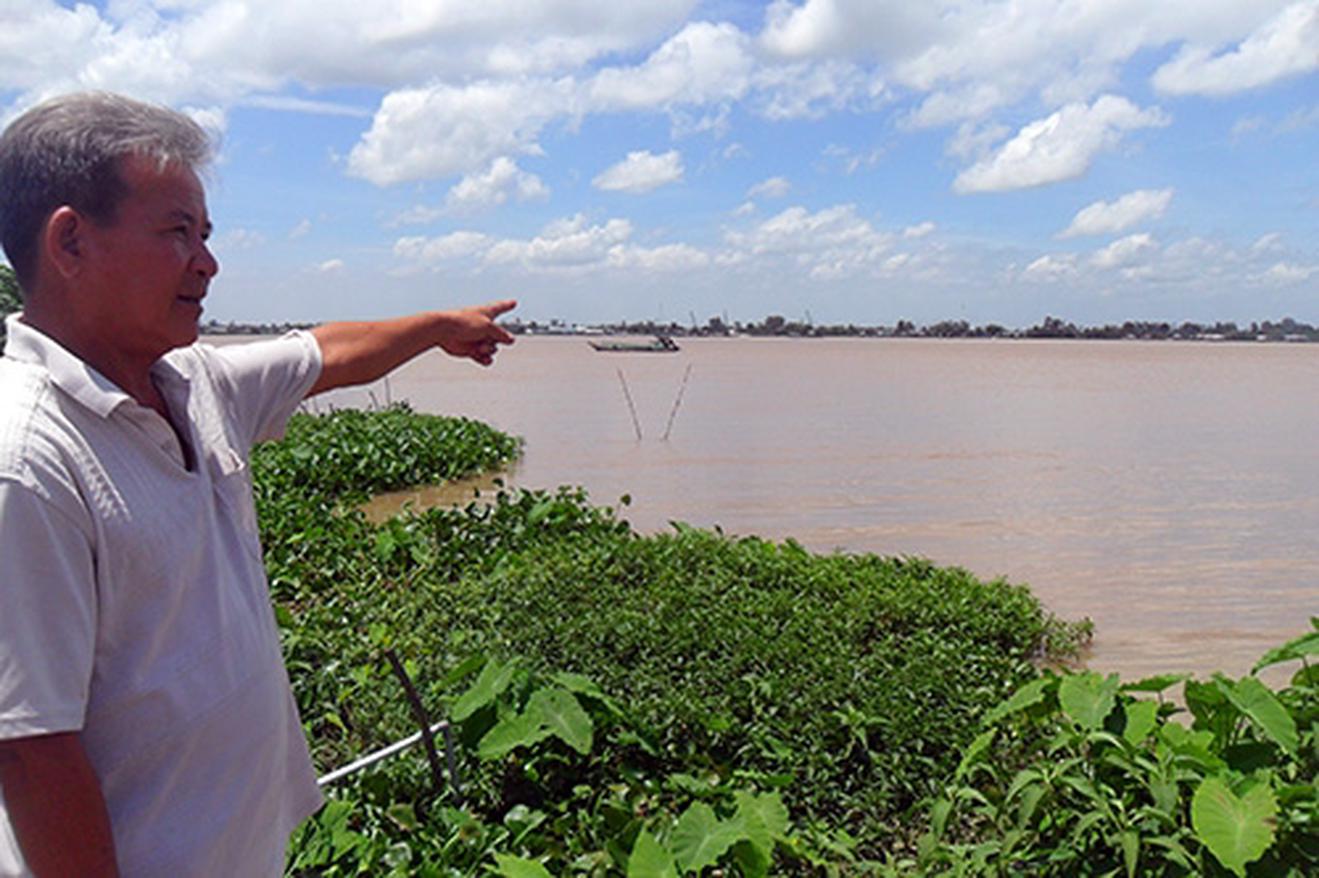 Ông Nguyễn Văn Côn chỉ vị trí cồn Cả Đôi từng hiện hữu trên sông Hậu, giờ đã biến mất. Ảnh: Cửu Long