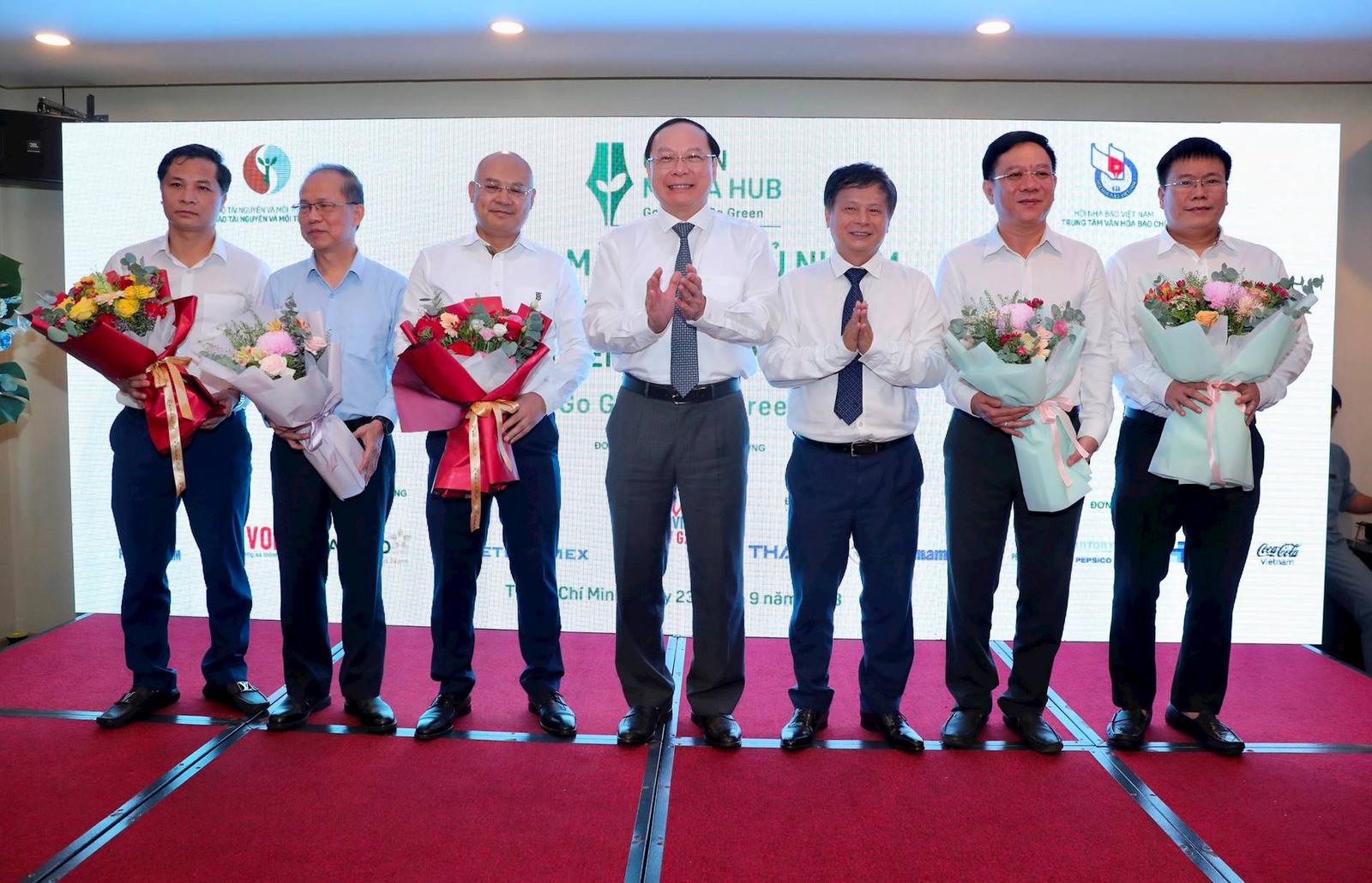 Thứ trưởng Bộ TN&MT Lê Công Thành, Phó Chủ tịch Hội Nhà báo Việt Nam Trần Trọng Dũng tặng hoa Ban Chủ nhiệm Câu lạc bộ Báo chí phát triển xanh hướng đến Net Zero nhân lễ ra mắt