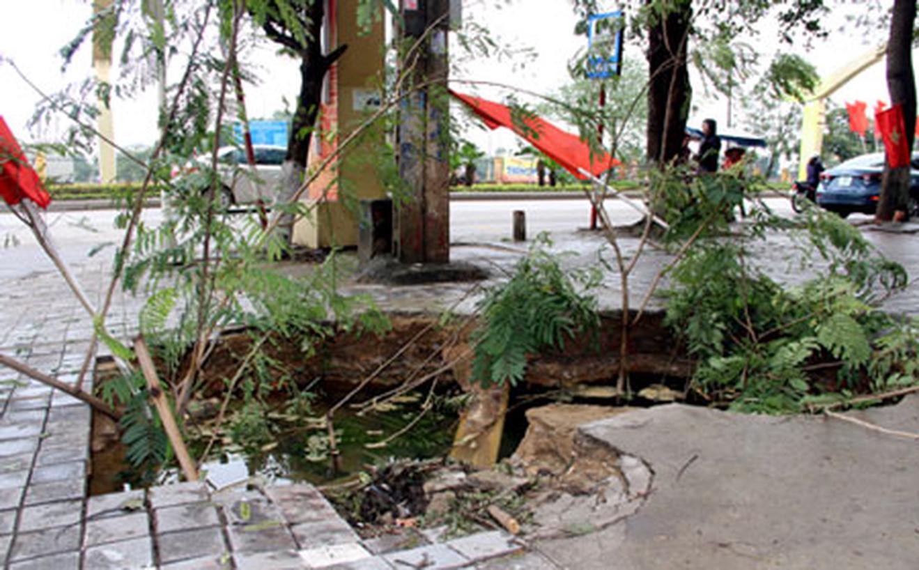 Hố rộng gần 4 m bất ngờ xuất hiện ngay trên vỉa hè đại lộ lớn TP Thanh Hóa khiến nhiều người dân lo lắng.
