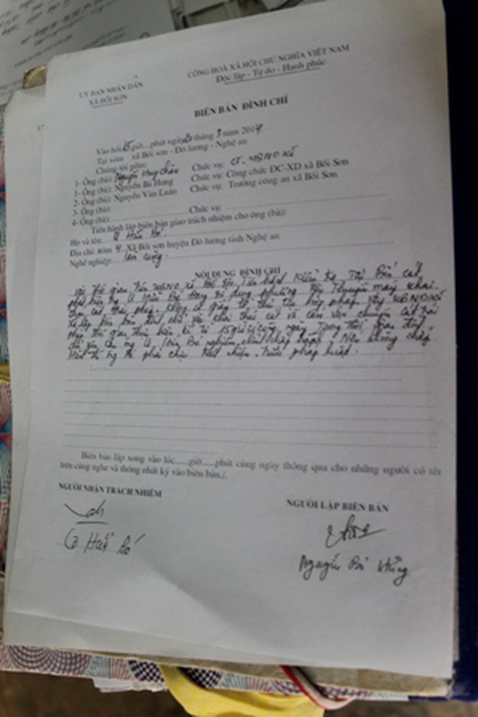 Biên bản đình chỉ hoạt động bến cát tại xã Bồi Sơn, huyện Đô Lương. Ảnh: Lương Ý