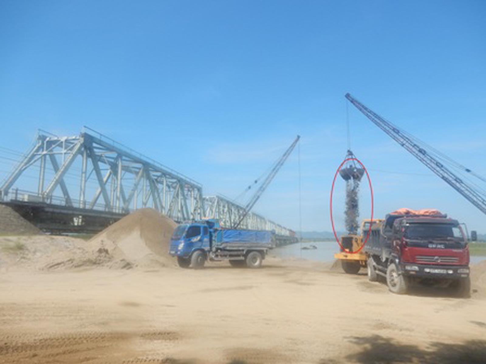 Xe chở cát dưới chân cầu Yên Xuân, đi lên ngay sát đường tàu rất nguy hiểm. Ảnh: Lương Ý
