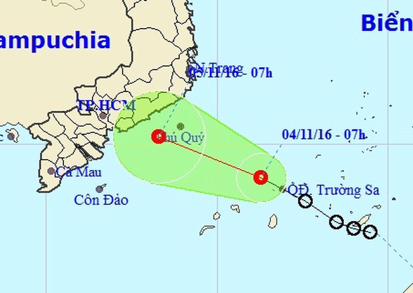 * Bản tin phát hồi 9.00’ ngày 4/11 của Trung tâm Dự báo Khí tượng Thủy văn Trung ương cho biết, hồi 07 giờ ngày 04/11, vị trí tâm áp thấp nhiệt đới ở vào khoảng 9,0 độ Vĩ Bắc; 111,3 độ Kinh Đông, trên vùng biển phía Tây quần đảo Trường Sa. Sức gió mạnh nhất ở vùng gần tâm áp thấp nhiệt đới mạnh cấp 6 (40-50km/giờ), giật cấp 7-8.