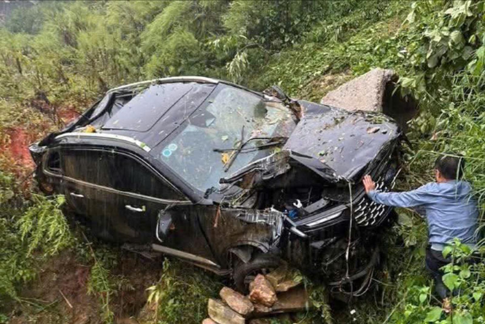 Xe ô tô bị hất xuống vực sâu, may mắn không có thiệt hại về người. Ảnh: Internet