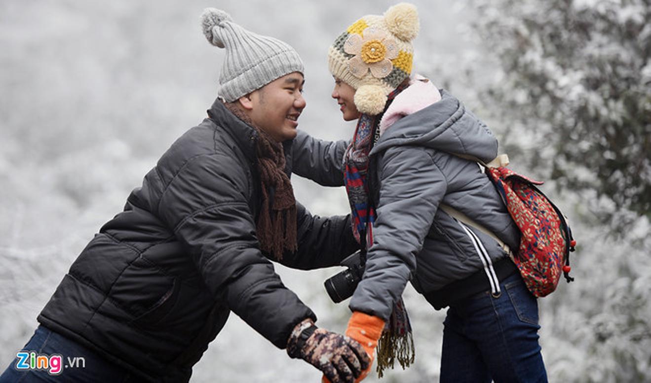 Sáng 31/1, khu vực thác Bạc, đèo Ô Quy Hồ có tuyết rơi trắng xoá, khiến nhiều du khách thích thú. Ảnh: Hoàng Hà.