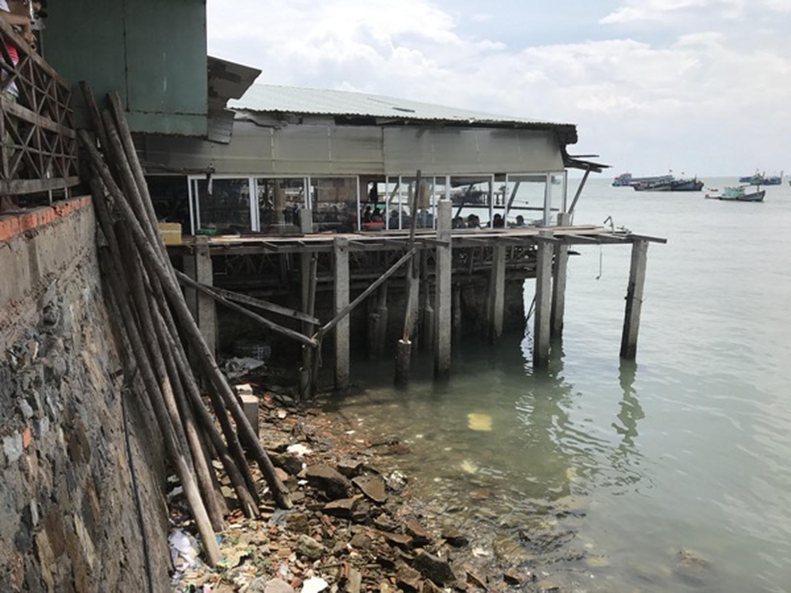 Phía bên phần mép bờ biển, có gần chục nhà hàng, hầu hết được xây dựng lấn chiếm mặt nước biển để kinh doanh diễn ra từ nhiều năm trước nên đã xuống cấp, kết cấu cọc gỗ, lớp bảo vệ bằng bê tông đã nứt gãy, xuống cấp, sàn giả bê tông, nền gạch men, mái tôn, vách tạm...