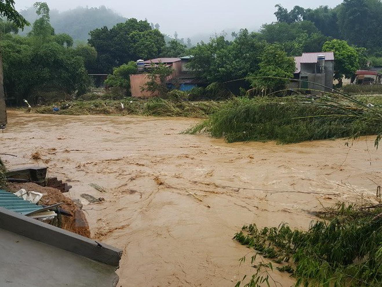 Nước lên cao tại Ngòi Đum chảy qua xã Đồng Tuyên, thành phố Lào Cai rạng sáng 5/8. (Ảnh: Lục Thu Hương/TTXVN)