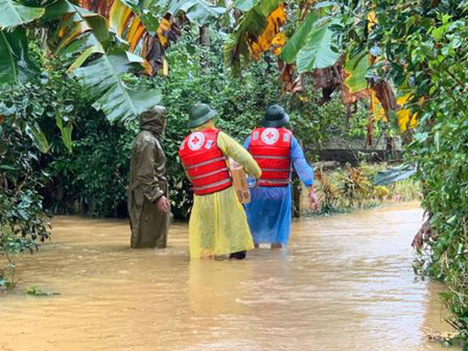 Hội Chữ thập đỏ Hà Tĩnh đi vào các khu vực ngập lụt ở huyện Hương Khê để hỗ trợ người dân. Ảnh: Hải Yến