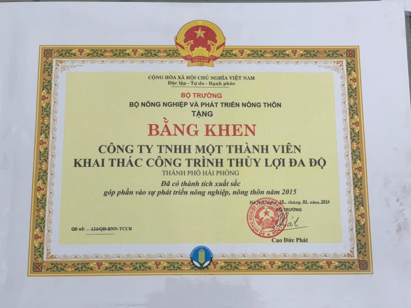 Ghi nhận những nỗ lực và thành tích đạt được trong công tác thuỷ lợi, Bộ NN&PTNT, UBND TP. Hải Phòng đã trao tặng nhiều bằng khen cho Cty Đa Độ