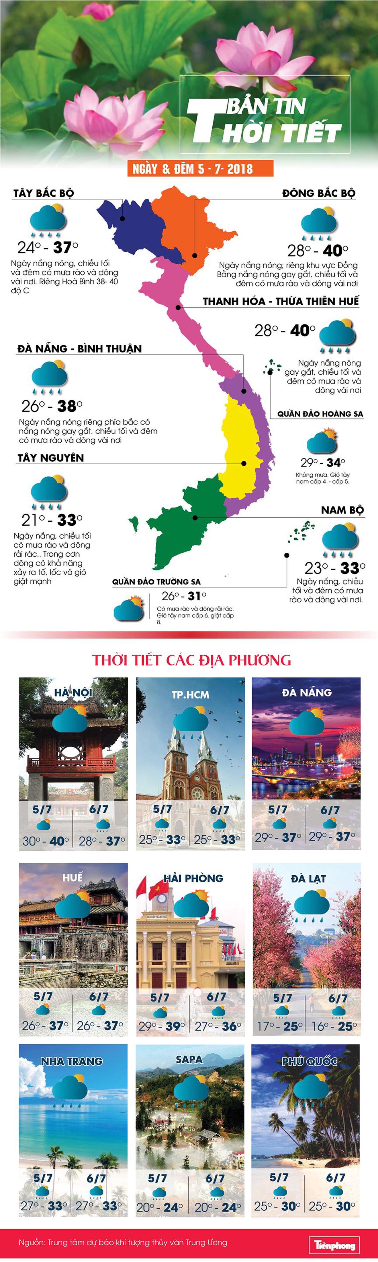Đồng Bằng Bắc Bộ có nắng nóng gay gắt với mức nhiệt 38 – 40 độ C, từ đêm mai (6/7), khu vực Bắc Bộ hình thành rãnh thời tiết xấu gây mưa rào và dông cho vùng núi và sang ngày mùng 7, mưa dông tăng lên về diện và lượng cho khu vực Bắc Bộ thì nắng nóng mới giảm đáng kể.