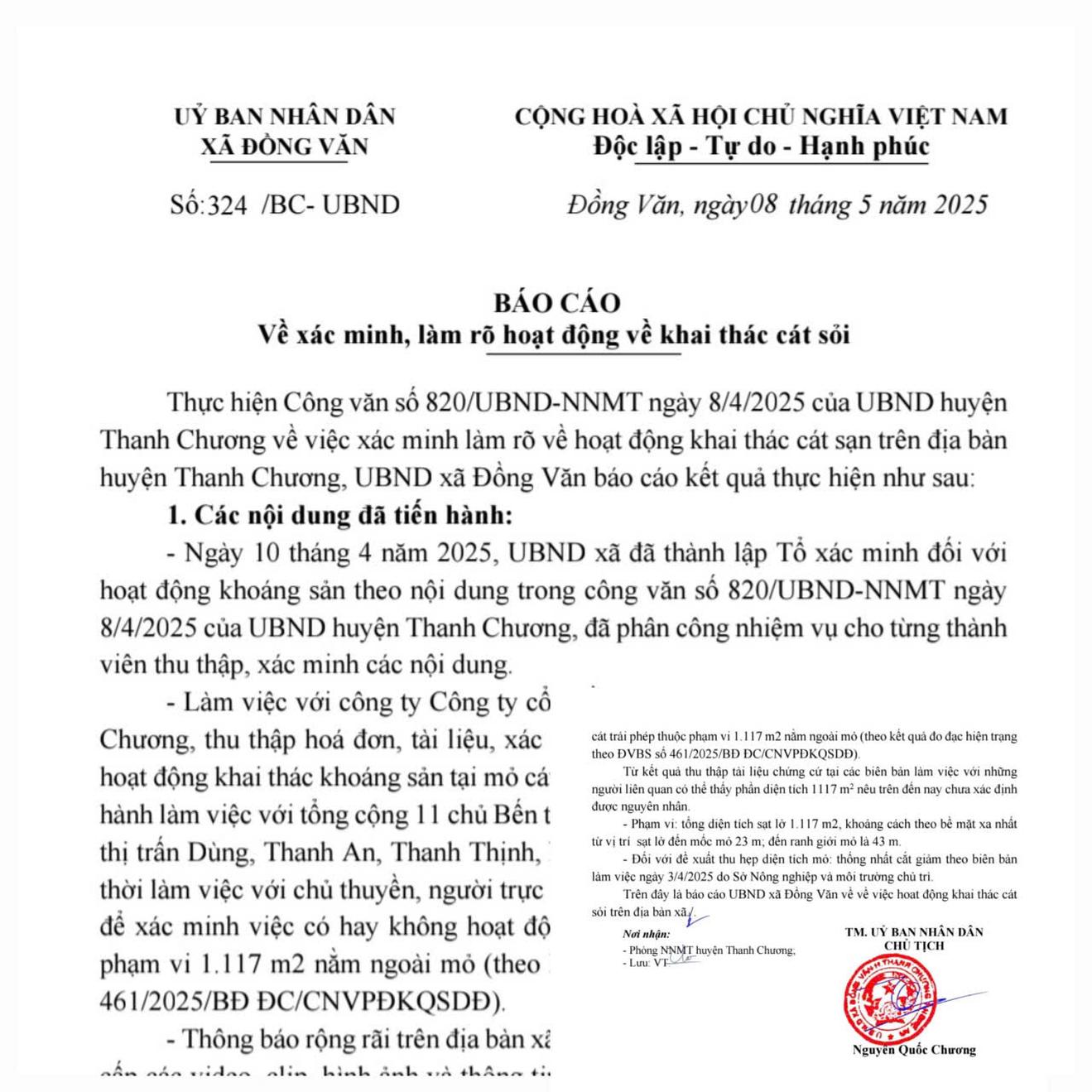 Diện tích sạt, lở là 1.117m2 thuộc địa phận xã Đồng Văn nằm ngoài phạm vi khu vực mỏ xã Đồng Văn, huyện Thanh Chương theo Giấy phép khai thác khoáng sản số 2905/GPUBND ngày 10/7/2018 của UBND tỉnh (kết quả đo đạc hiện trạng ĐVBS số 461/2025/BĐĐC/CNVPĐKQSDĐ duyệt ngày 1/4/2025).