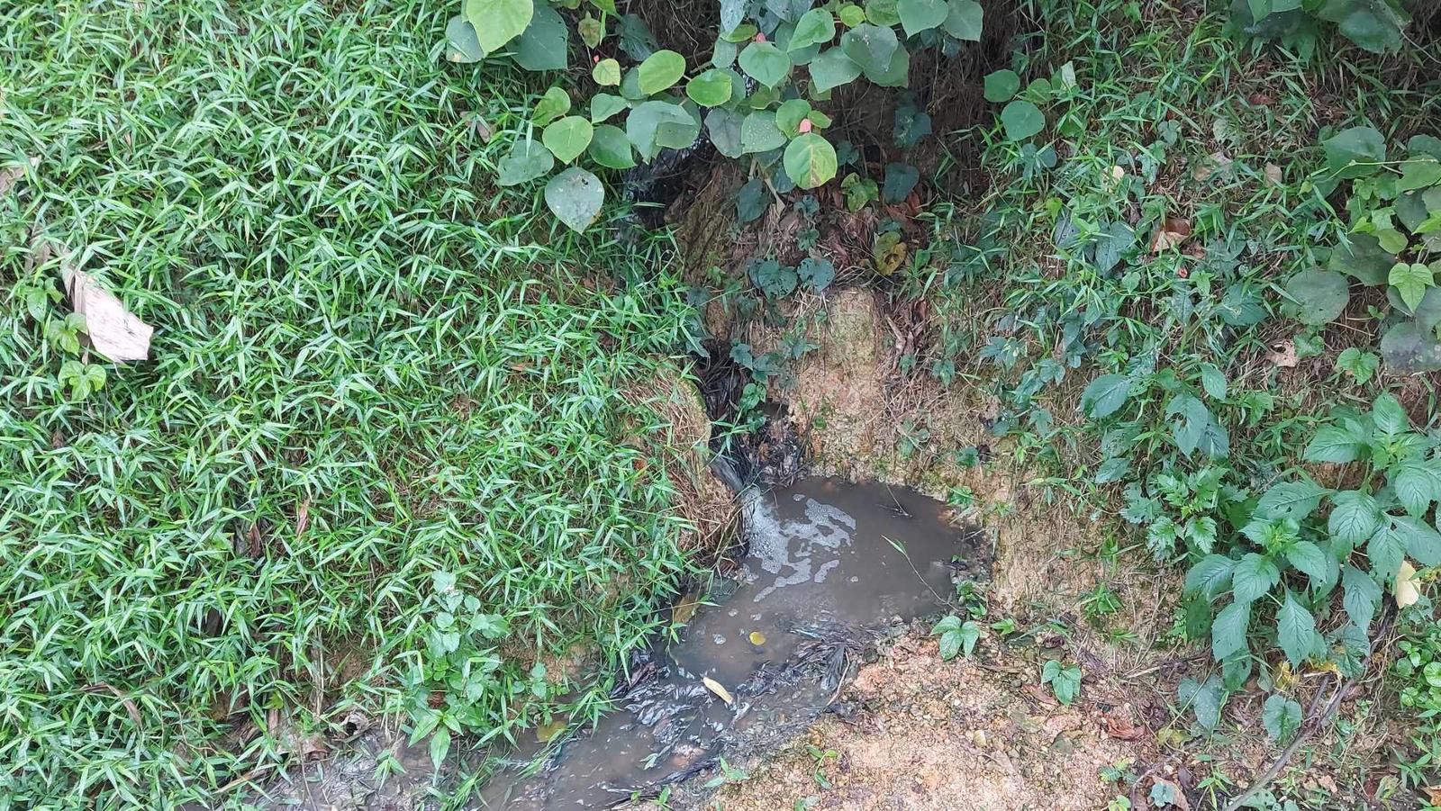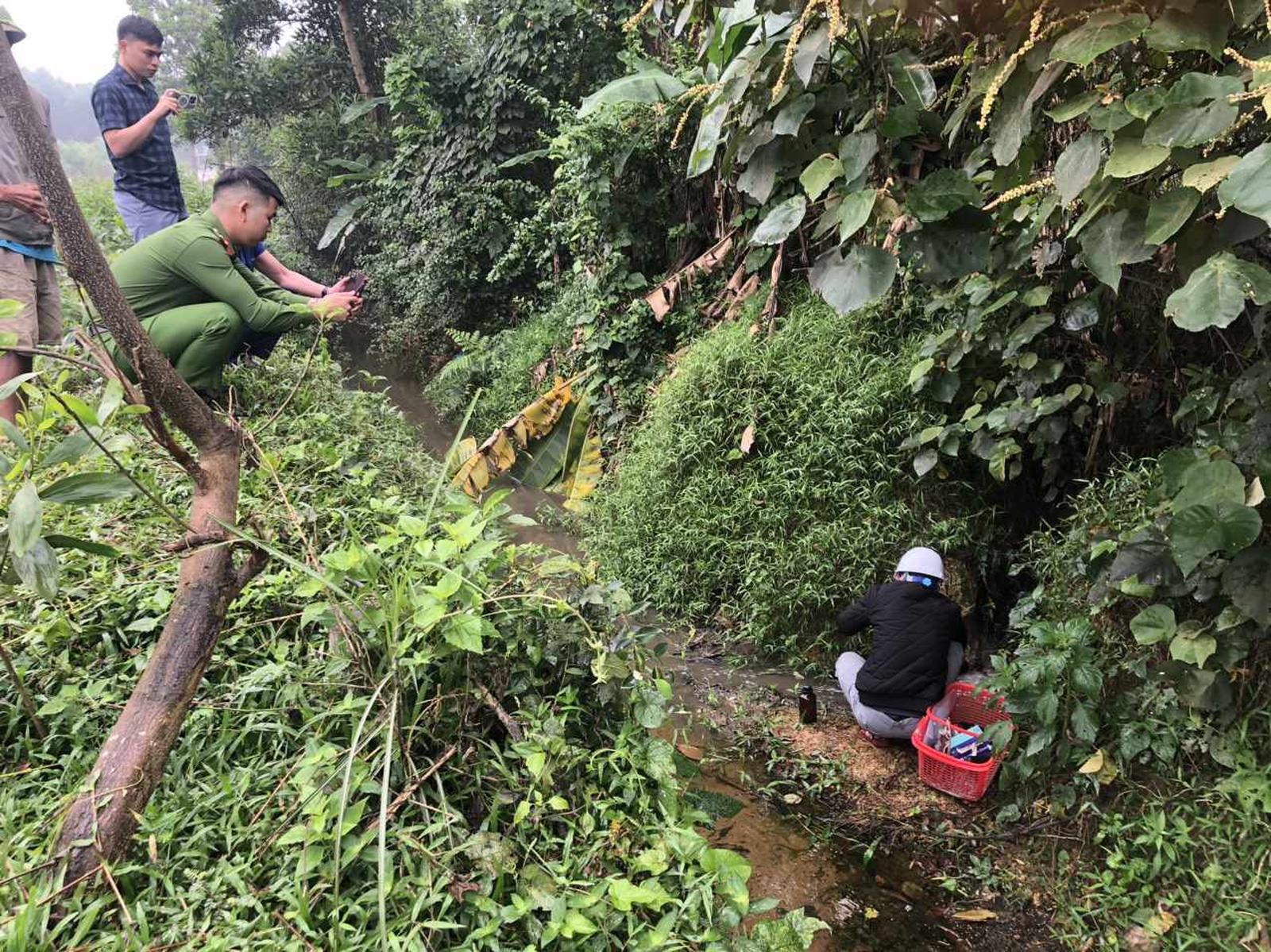 Lực lượng chức năng tiến hành kiểm tra hiện trường khu vực xả thải từ trong trang trại ra ngoài mương nước, đồng thời lấy mẫu đi kiểm tra. Ảnh: Hải Yến
