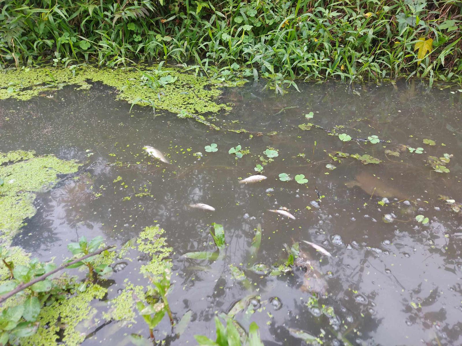 Cá chết nổi lềnh bềnh trên mương nước gần khu vực xả thải. Ảnh: Hải Yến