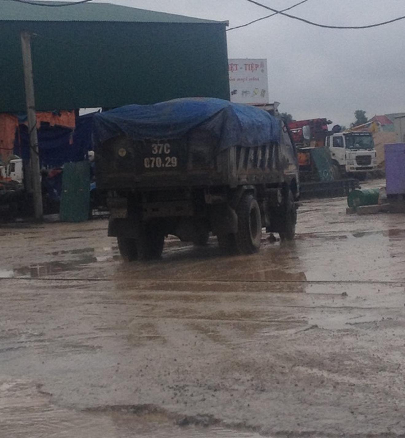 Những chiếc xe chở cát, đá có dấu hiệu quá tải vào ra Nhà máy bê tông Vinh Thành. Ảnh: KL