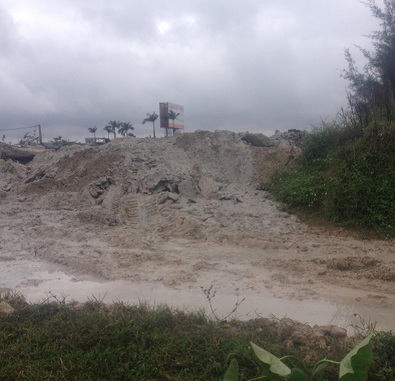 Chất thải rắn được Nhà máy bê tông Vinh Thành chất ngổn ngang ngay trên đường. Ảnh: KL