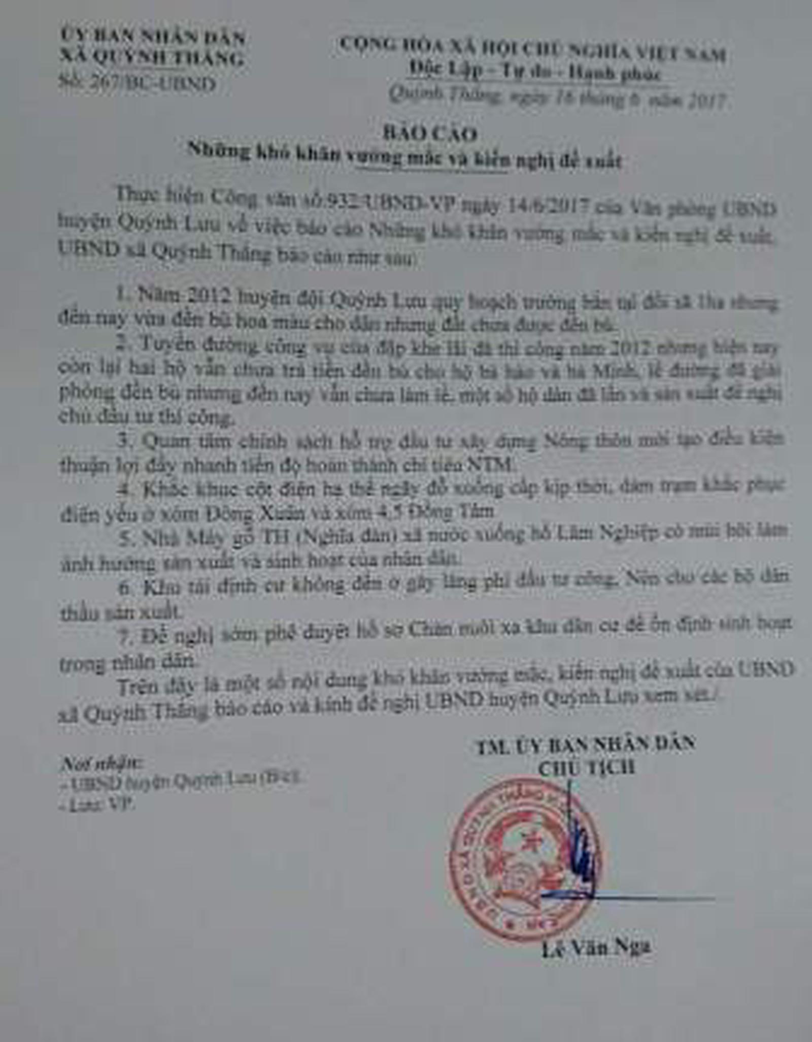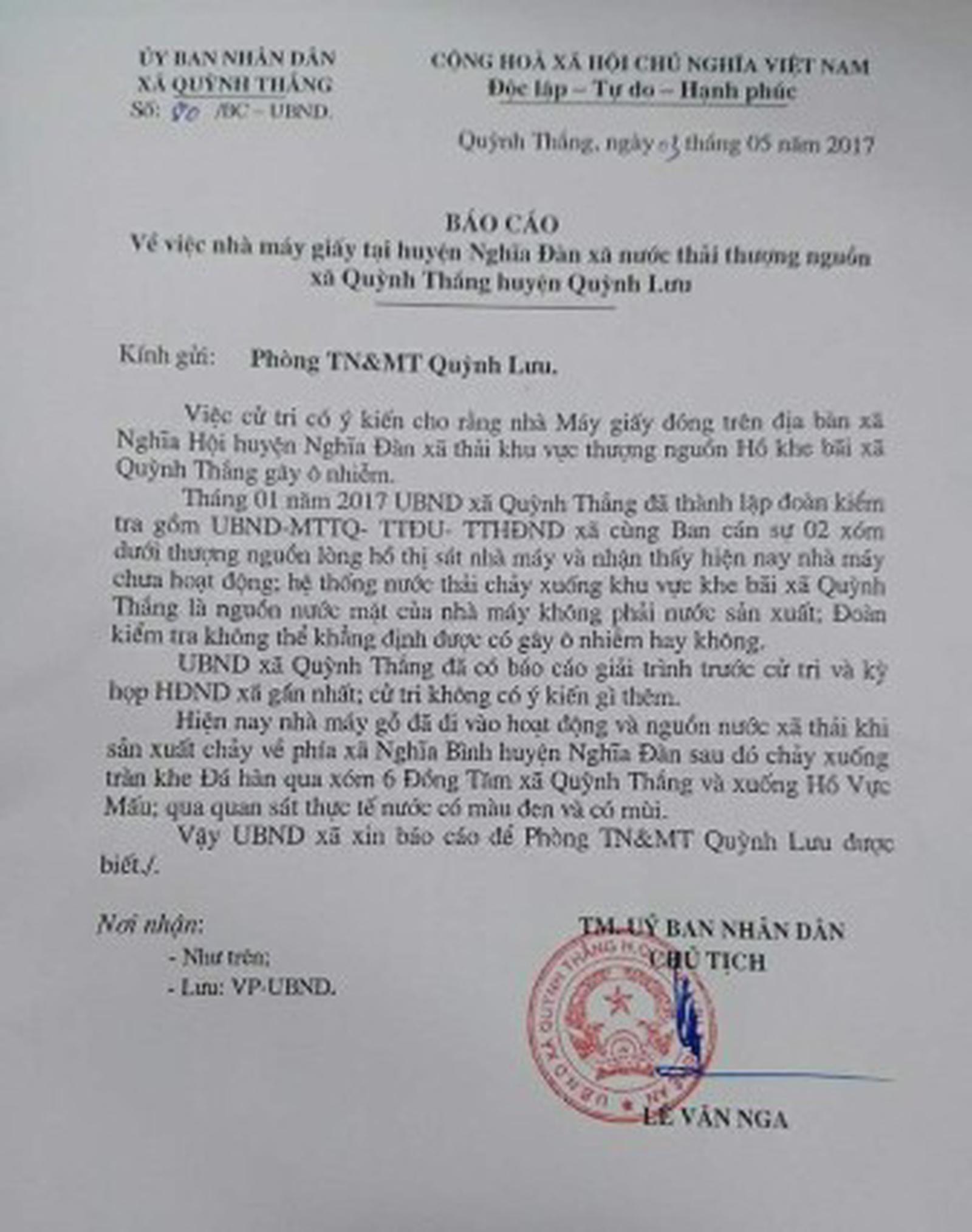 Văn bản 6/2017 xã Quỳnh Thắng phản ánh về việc xả thải của Nhà máy Chế biến gỗ Nghệ An. Ảnh: Trần Lê