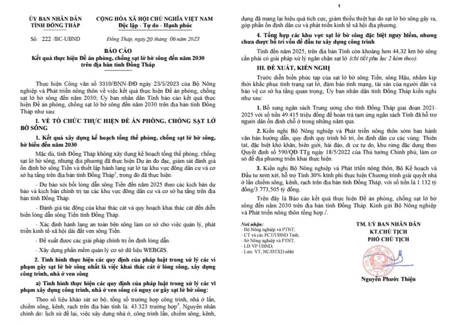 Báo cáo kết quả thực hiện Đề án Phòng, chống sạt lở bờ sông đến năm 2030 của UBND tỉnh Đồng Tháp. Ảnh: Thu Huyền