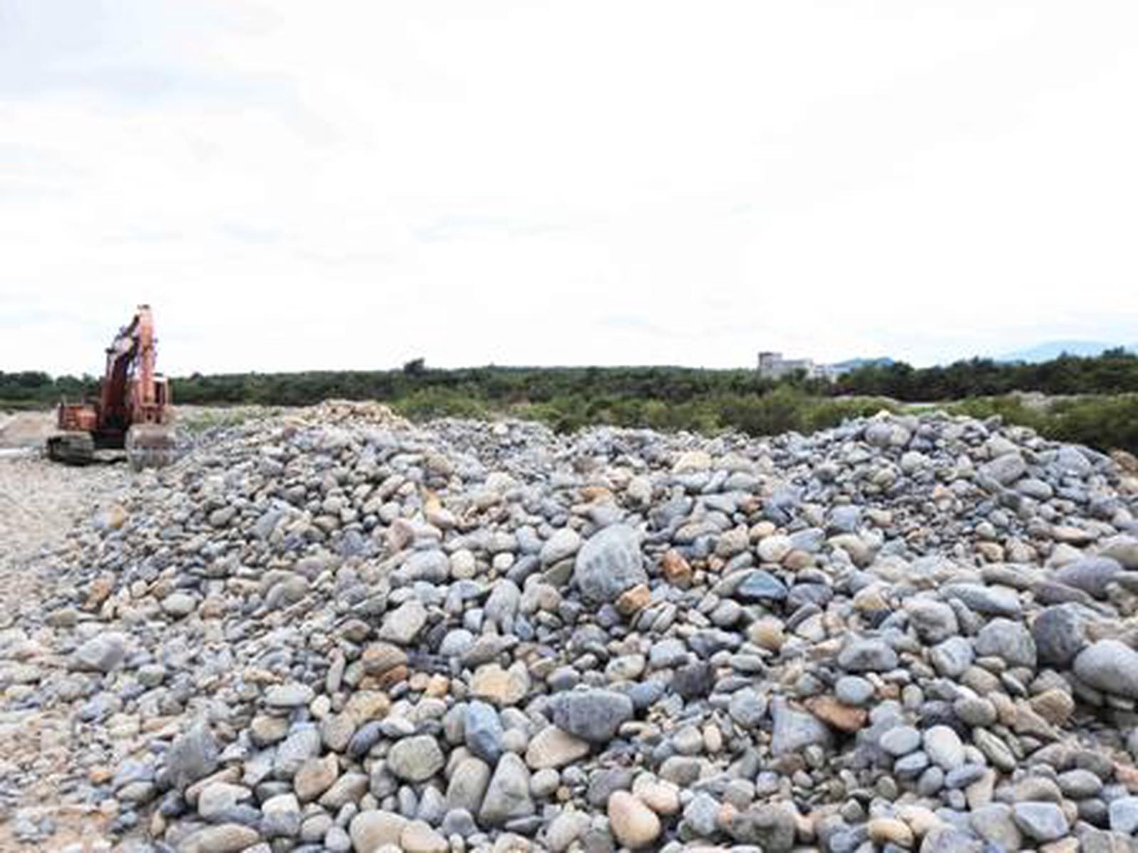 Các doanh nghiệp đang dùng xe cơ giới di chuyển các đống đá lớn trước mùa mưa bão. Ảnh: Khoa Lê
