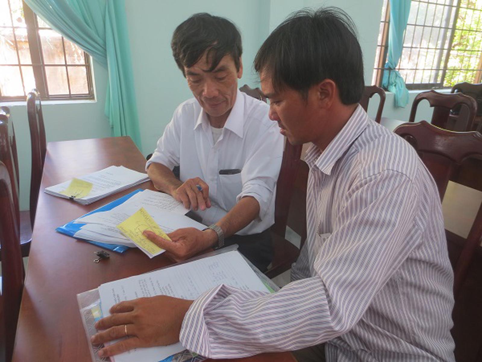 Luật sư và ngư dân trao đổi bàn bạc việc kiện DN ra tòa. Ảnh: BT