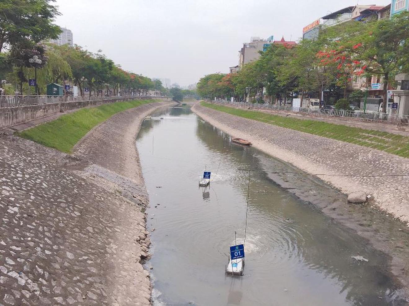 Đúng một tuần đặt máy, nước sông Tô Lịch đã trong và bớt mùi hôi. Ảnh: TL