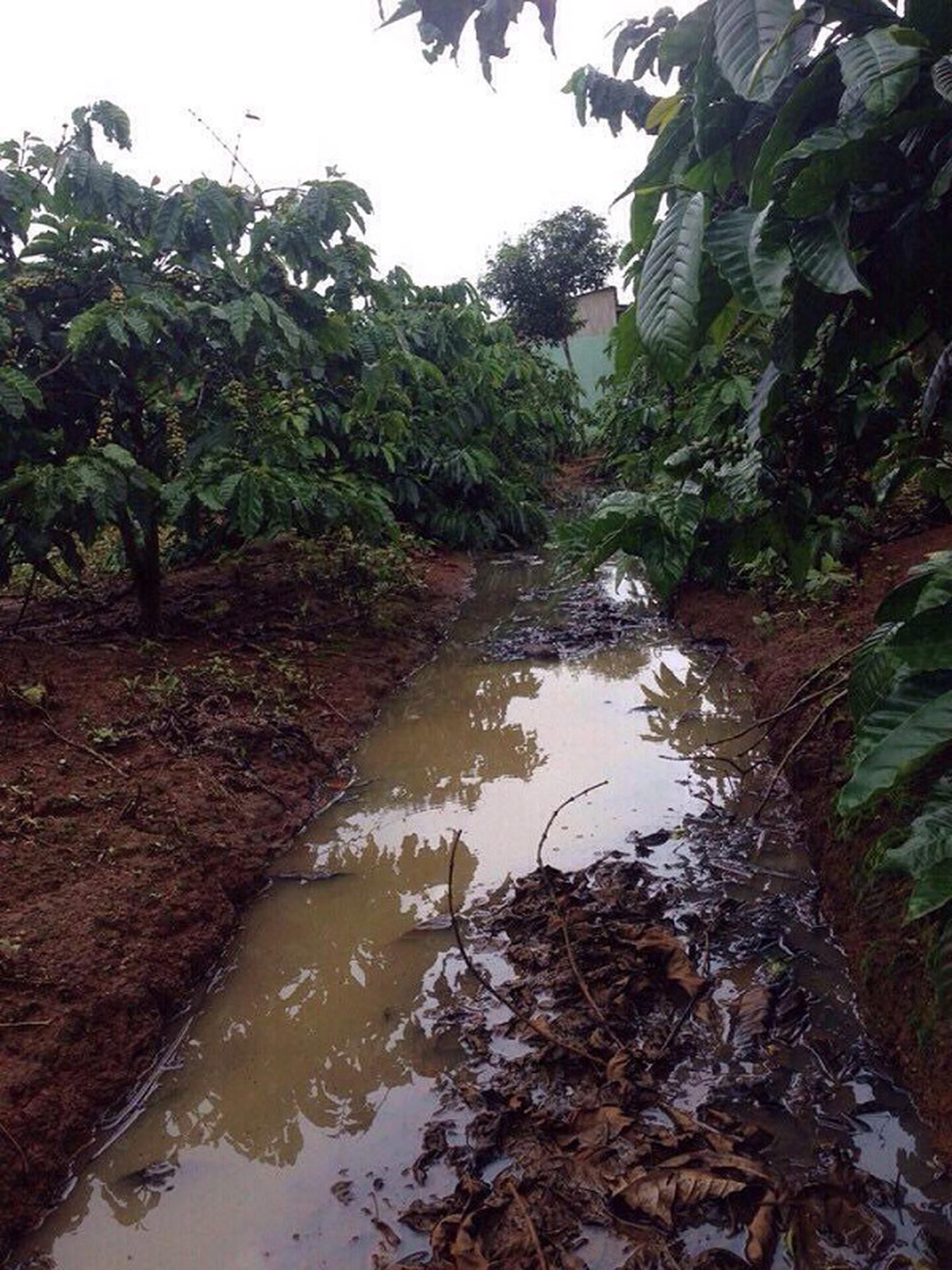 Khi thâm nhập thực tế, chúng tôi phát hiện ông Điền đào 5 rãnh trong rẫy cà phê sát khu dân cư, cạnh trại nuôi heo. 5 rãnh này ông Điền dùng để hàng ngày thải nước và chất thải chăn nuôi ra môi trường, quan sát thấy nước trong rãnh “nhuộm” một màu đen phân heo đặc quánh, từ đầu đến cuối bốc mùi hôi thối rất khó chịu.