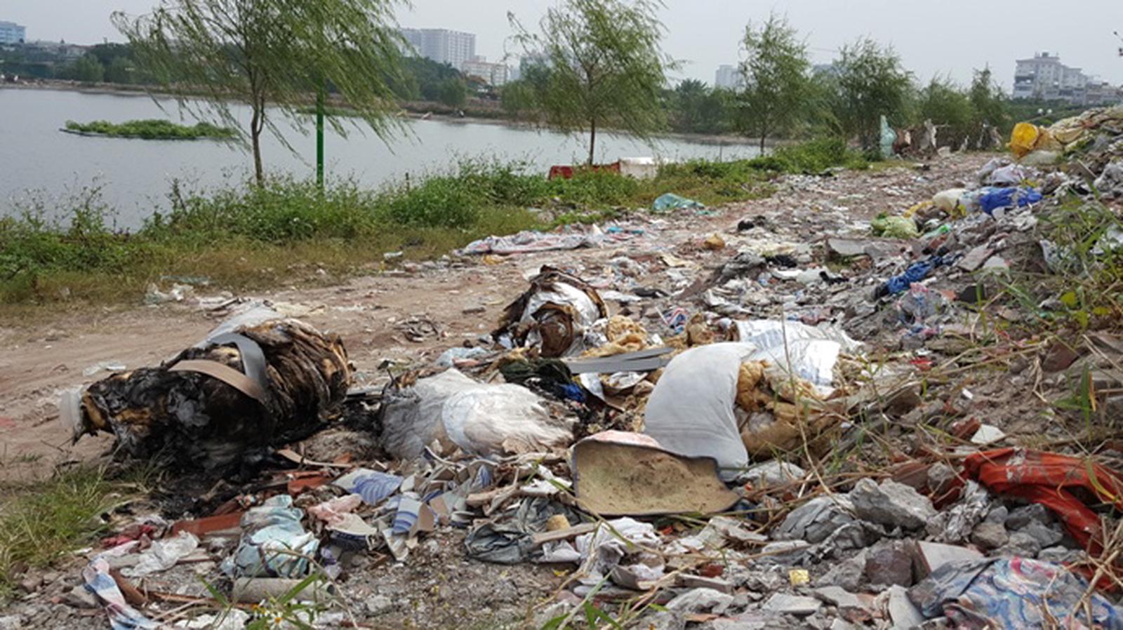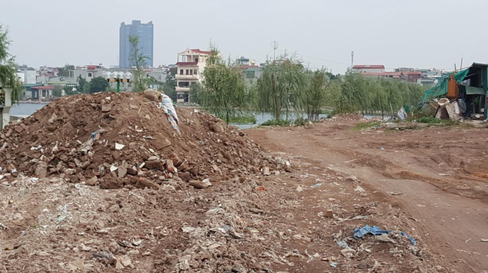 Phế thải xây dựng đổ tràn lan tại những bãi đất trống ven hồ. Ảnh: QĐ