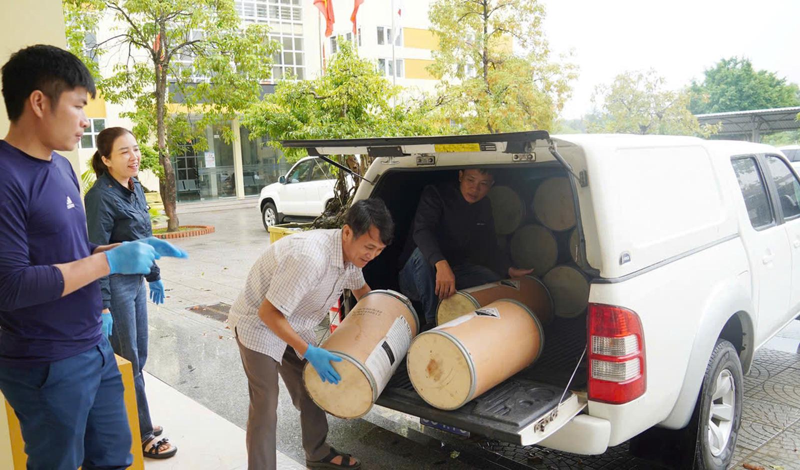Tập kết Cloramin đến hỗ trợ Trung tâm Y tế huyện Quảng Ninh. Ảnh: NH