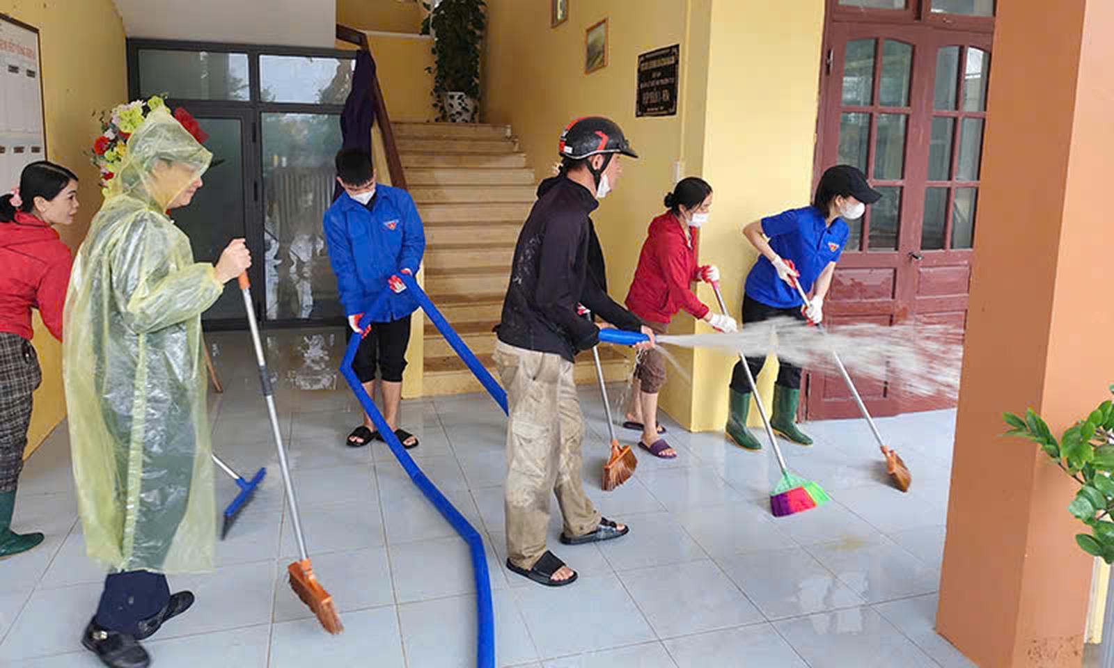 Các ban ngành đoàn thể và người dân giúp dọn dẹp trường học. Ảnh: BQB