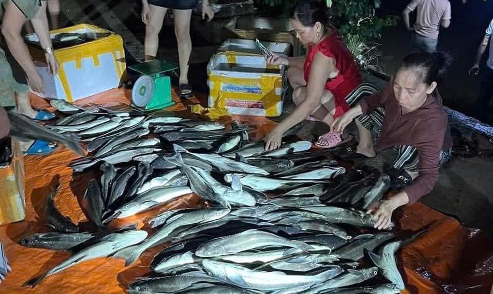 Thống kê sơ bộ tại Cửa Việt lượng nước thượng nguồn đổ về lớn đã khiến nhiều loại cá nuôi thả bè bị chết, ước thiệt hại ban đầu khoảng 2,25 tỷ đồng. Ảnh: Minh Tân