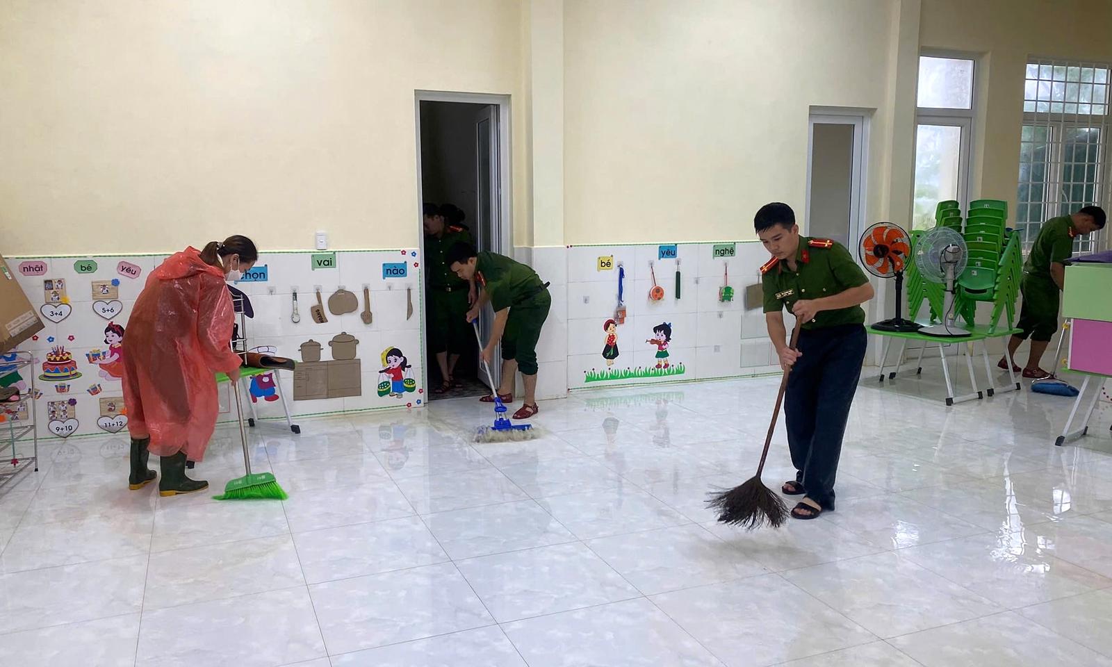 Lực lượng Công an huyện Vĩnh Linh giúp dọn dẹp, vệ sinh trường mầm non sau khi lũ rút. Ảnh: Minh Tân