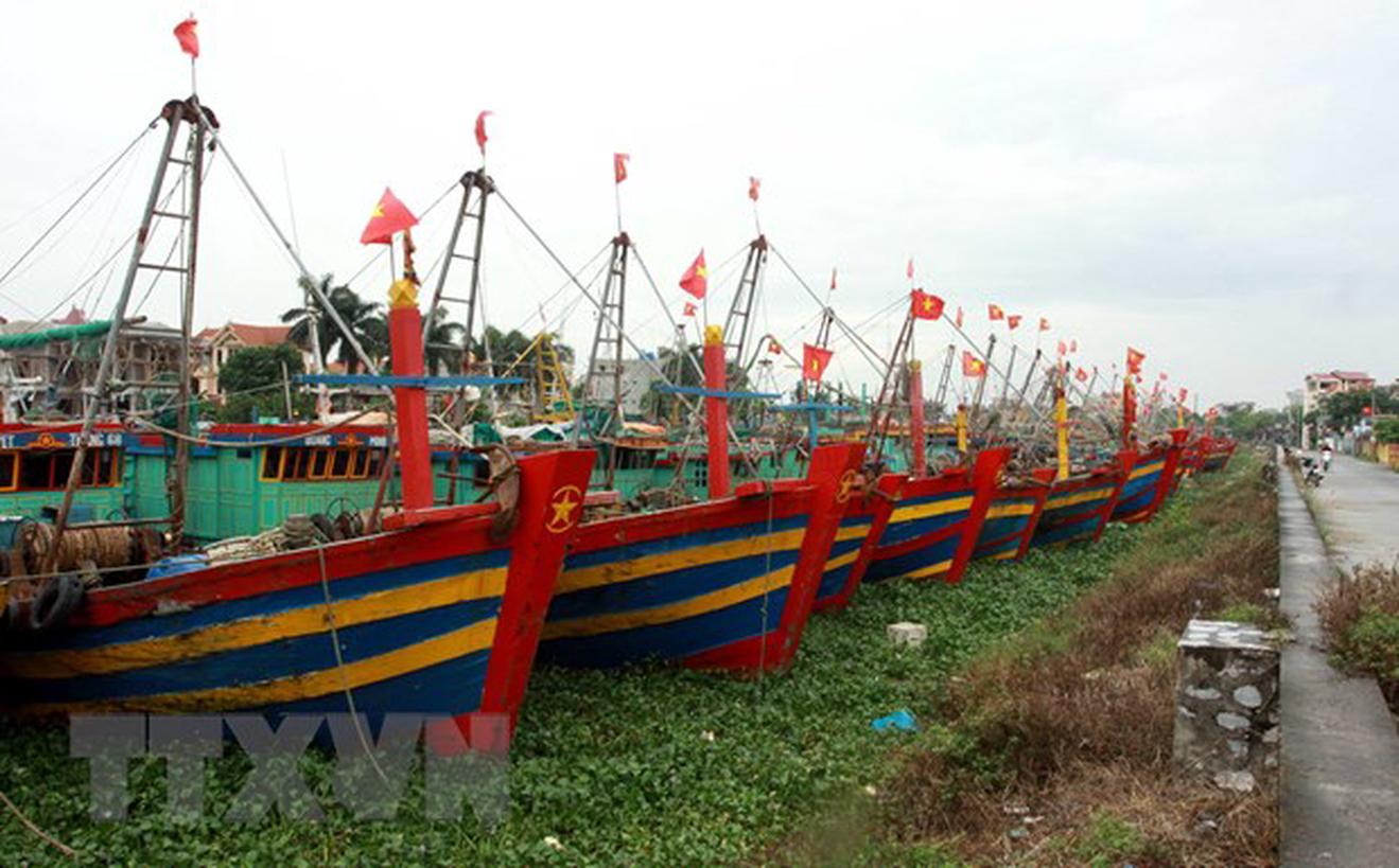 Các tàu về tránh trú bão tại cảng cá Tân Sơn, huyện Thái Thụy, Thái Bình. (Ảnh: Thế Duyệt/TTXVN)