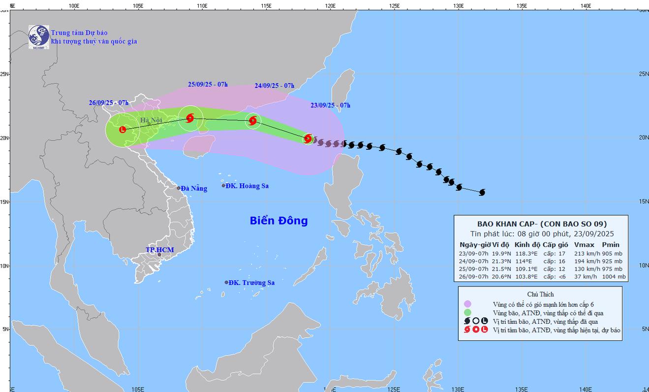Vị trí bão số 9 lúc 7h ngày 23/9. Ảnh: TTKTTVQG