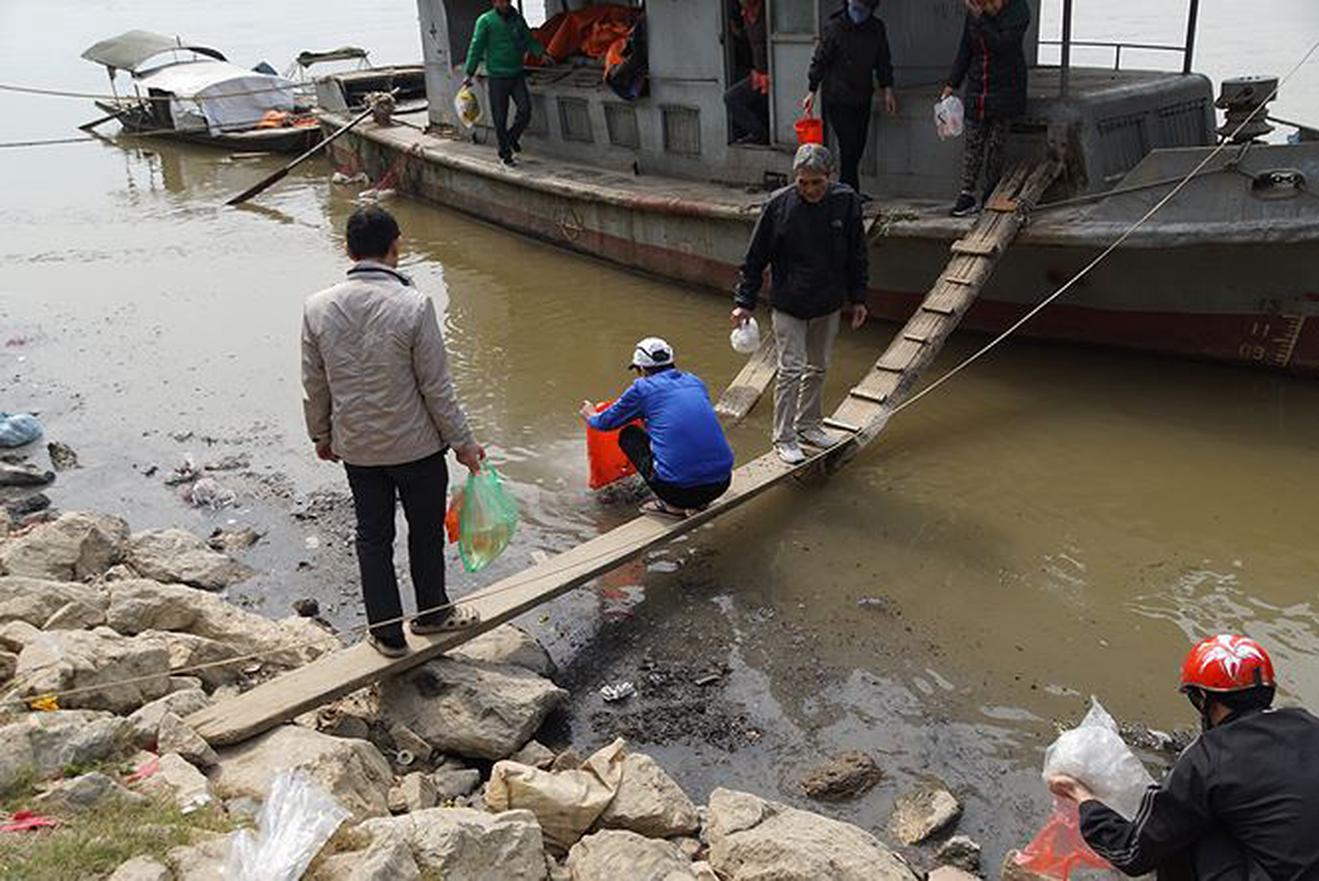 Hàng dài người đi xuống sông Hồng phía đầu cầu Chương Dương (Hà Nội) để thả cá và tro, chân nhang, thậm chí cả bàn thờ cũ sau lễ cúng ông công, ông táo (23 tháng chạp) khiến một khúc sông ô nhiễm trầm trọng.